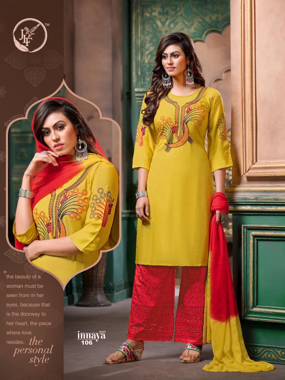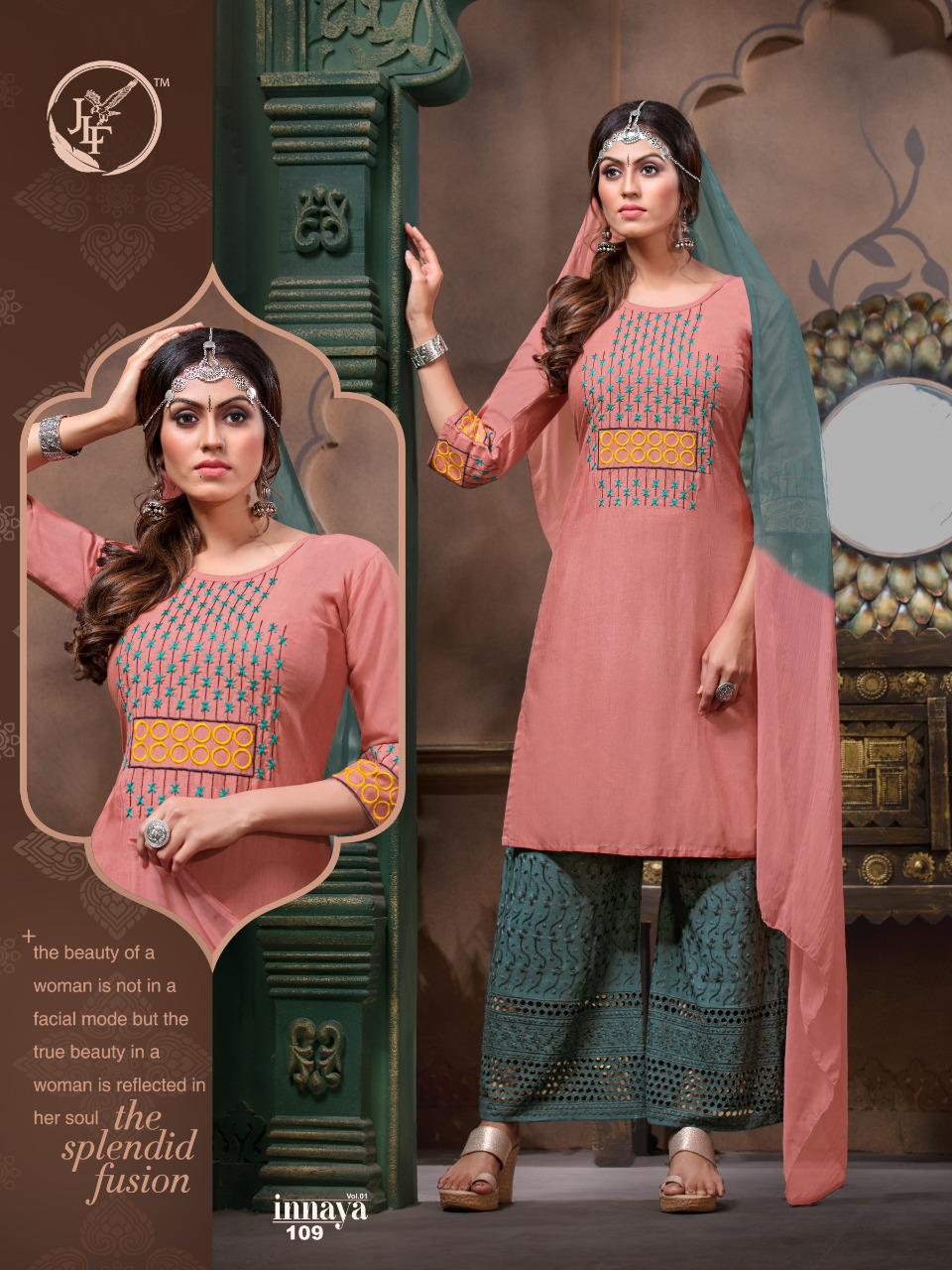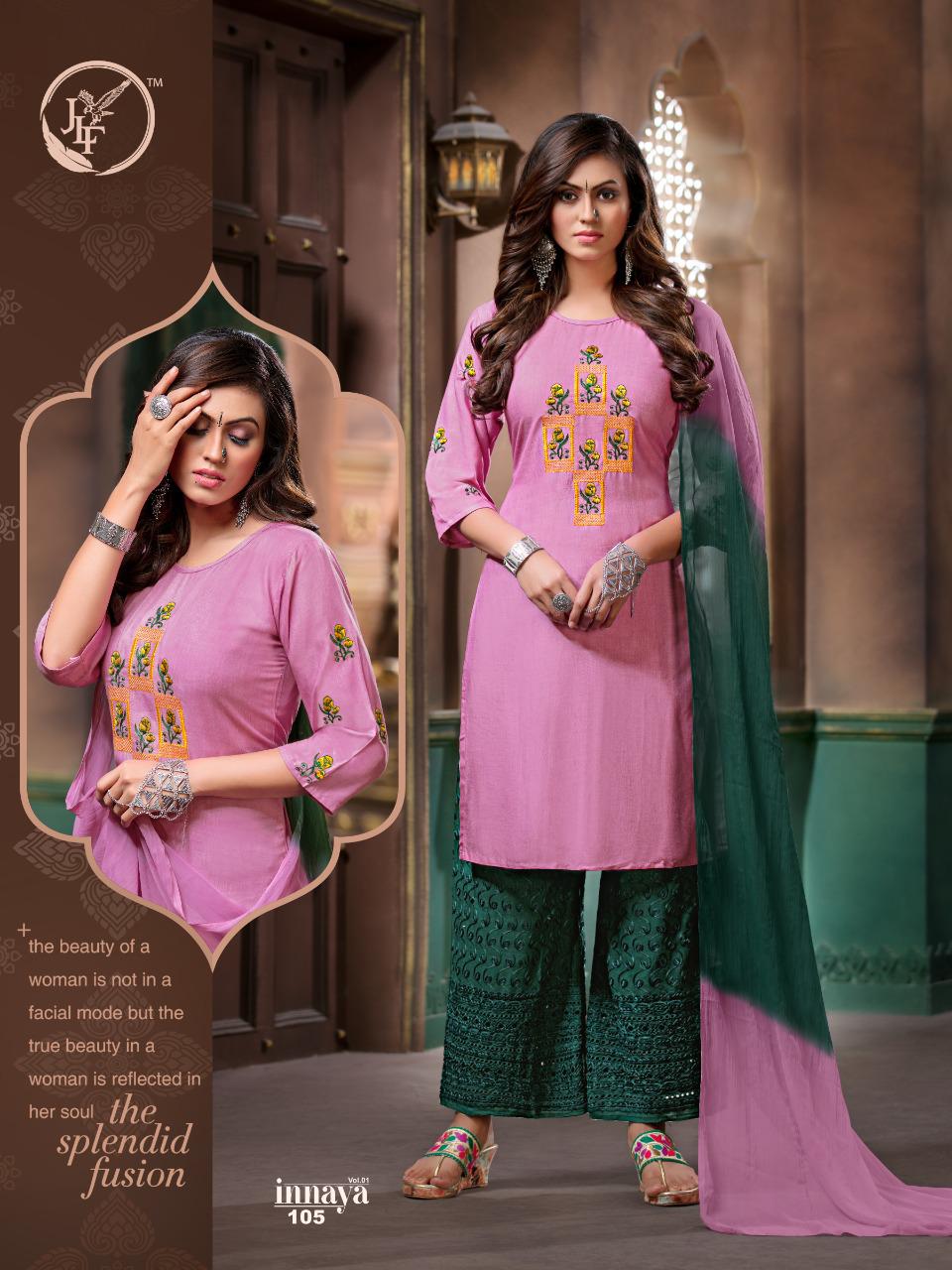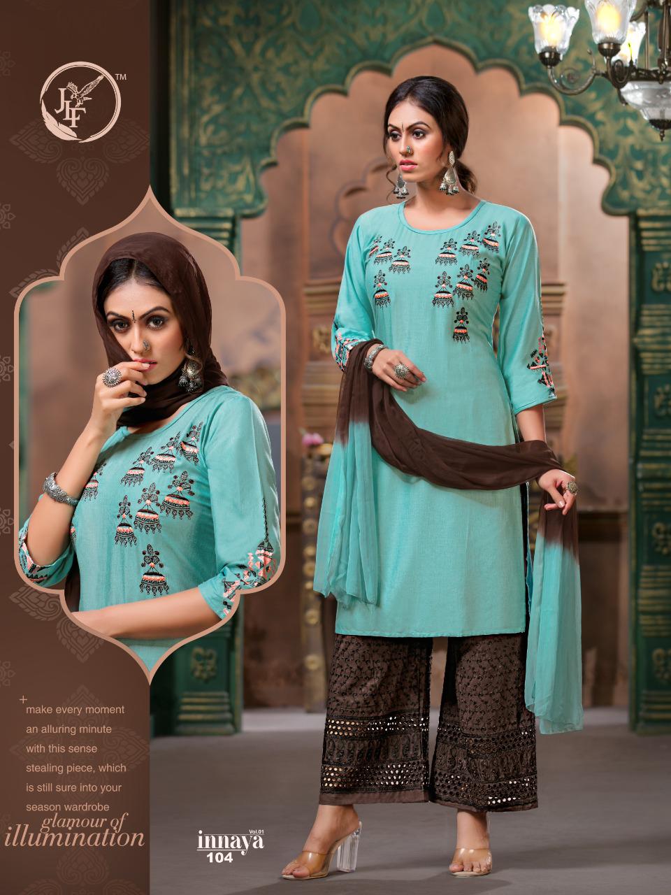 Jlf Presenting Innaya Vol 1 Rayon With Work Readymade Kurti Plazzo With Fancy Dupatta