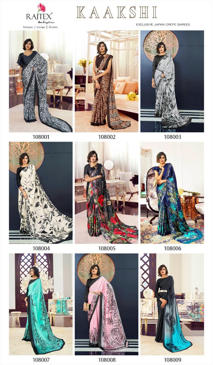KAAKSHI by Raj Tex *Japan Satin Crepe Sarees * Series -108001 to 108018 *Rate 525 per Pcs * GST 5 Percent Extra RAJTEX FABRICS Delivery from today |