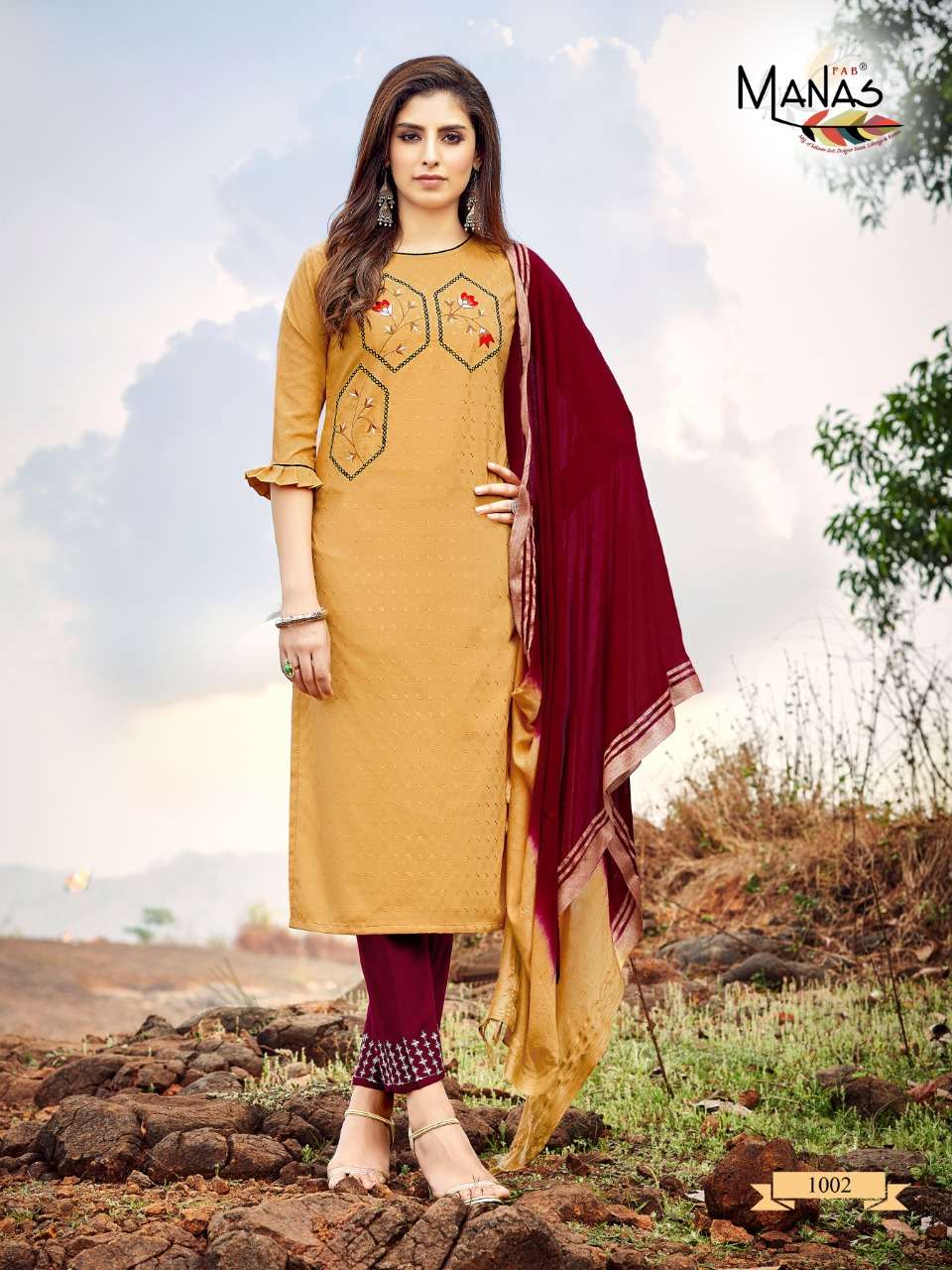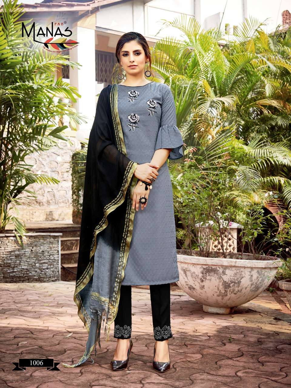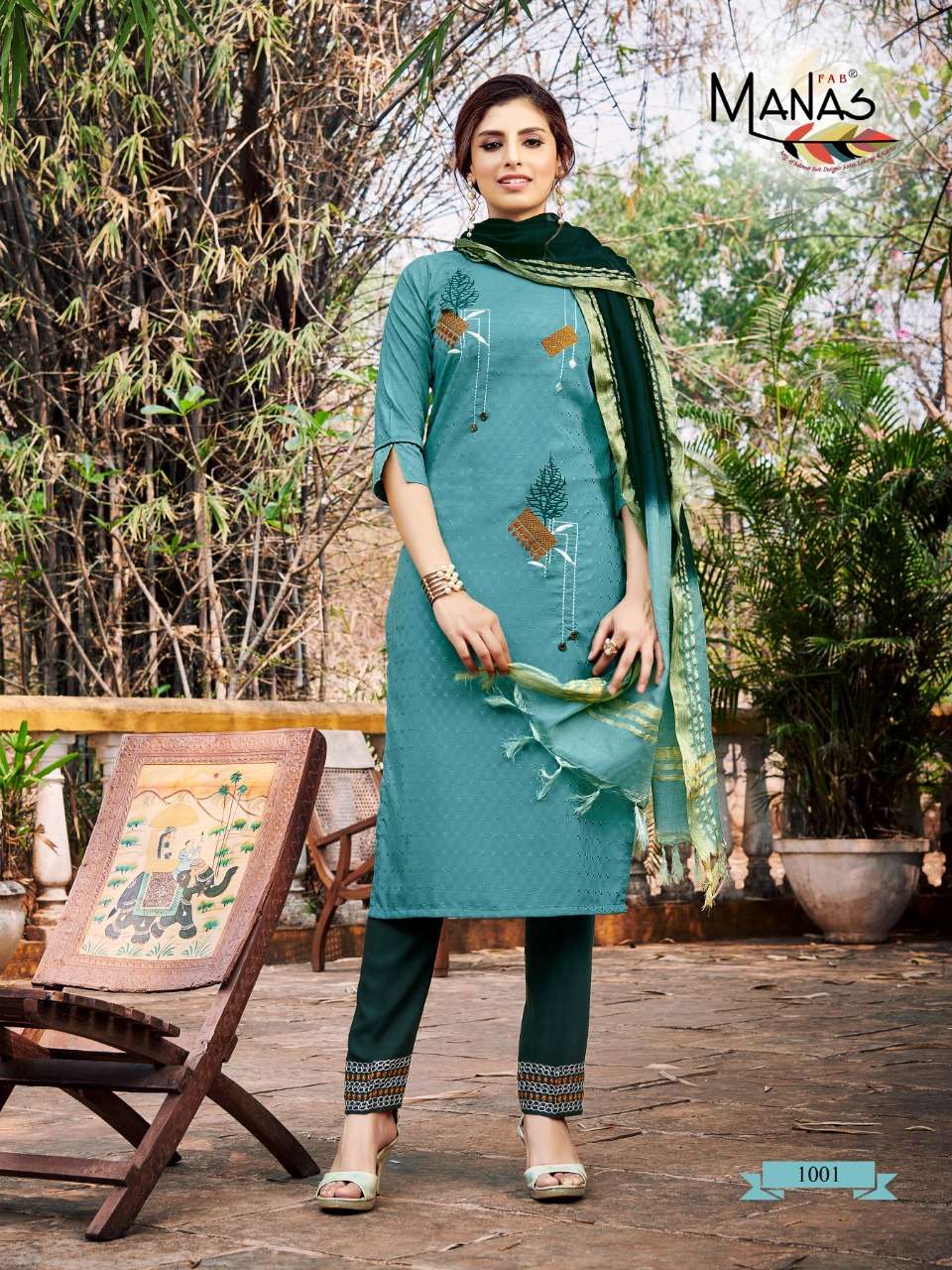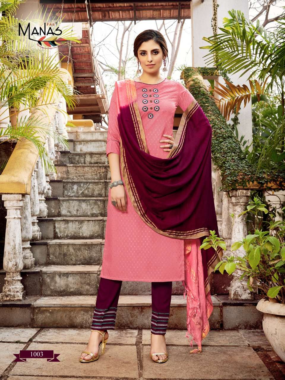 Brand Name : Manas Design : 6 👗Top Fabric : Fancy Dobby weaving with Embroidery work 👖Bottom Fabric: 14 kg rayon with embroidery work Duptta: Fancy fabric 🧶🧵Work: Embroidery Work 👗Top Length: 46+ Size : M(38), L(40), XL(42), XXL(44) 3XL(46) Rate : 775/-Pis + 5% GST Dispatch Date: 2 To 3 Day |