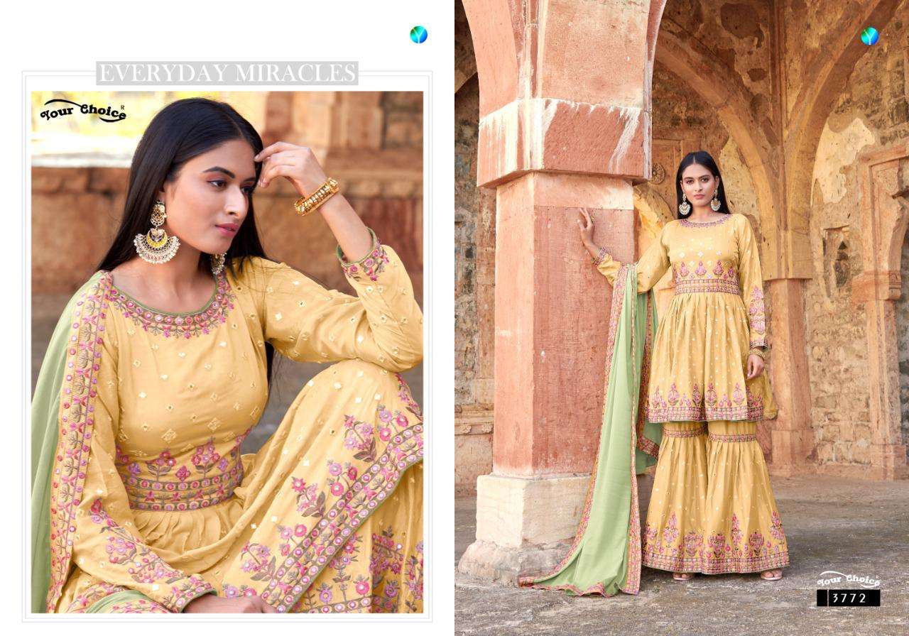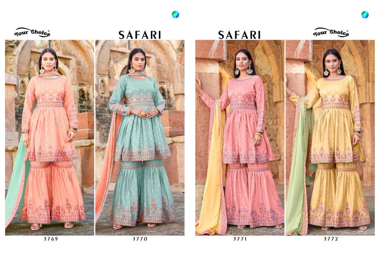 We KAARA suits launching our New catlouge SAFARI 100% Pure Cotton top with hand made tussels & Handwork Name - SAFARI Fabric details - Top - Cambric Cotton Print With Tussels & Handwork* Bot - Pure cotton dyed I (2.70 mtr app) Dup - Silver Chiffon Printed with Two Side Interlock 2.30 Mtrs # Handwork On Top # Special Attractive Packing Designs - 8 Rate - 499/-+GST |