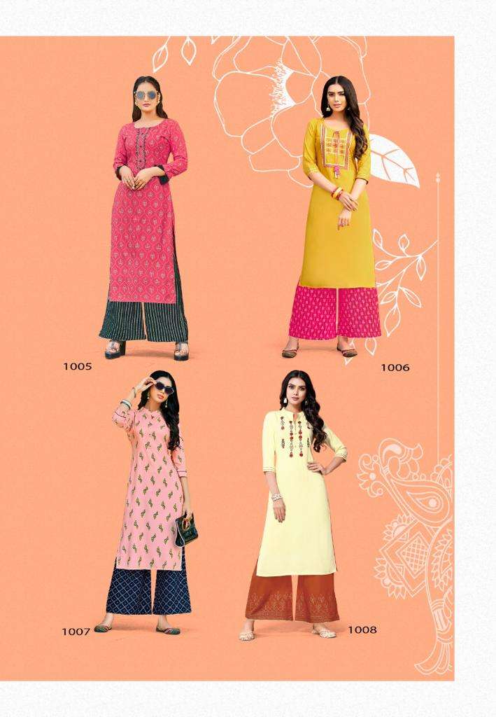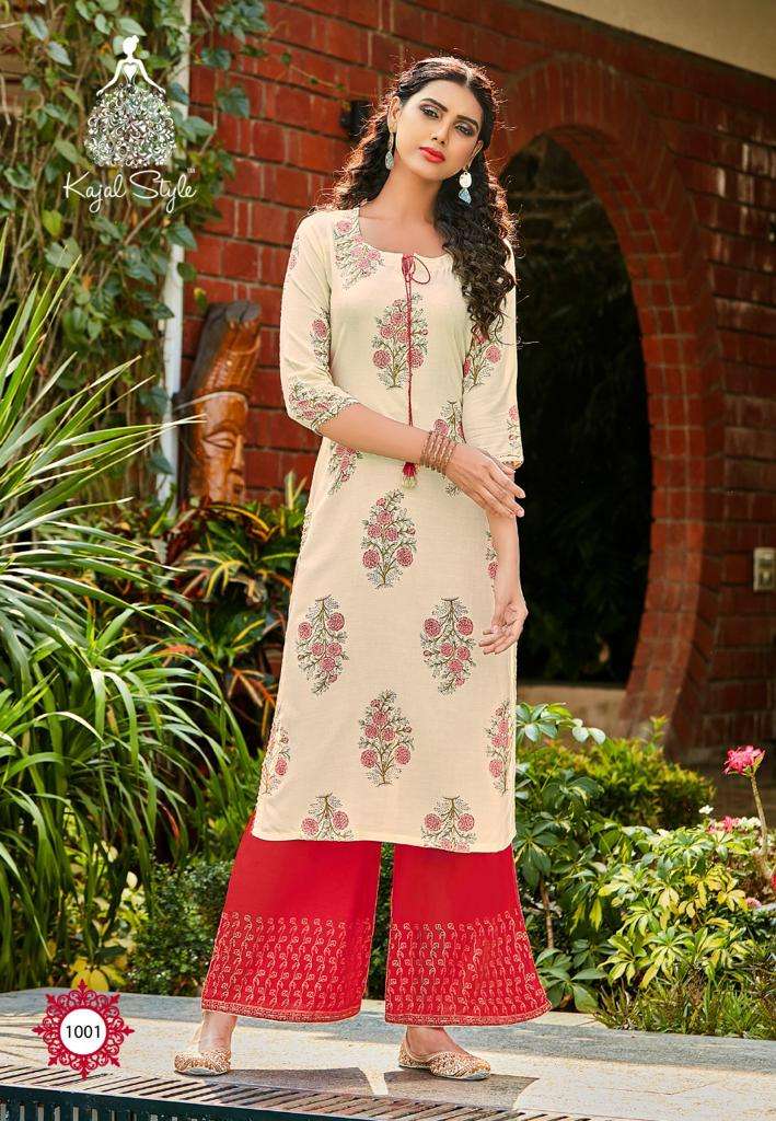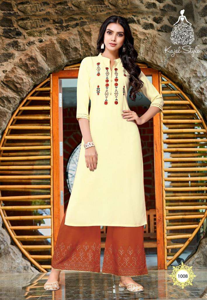 Kurtis With Plazzo Pair Collection Are Here To Bring Freshness In Your Daily Life Style. KAJAL STYLE Catalogue name: Fashion Diva Vol.1 Details Pattern:  KURTI WITH PLAZZO  PAIR Fabrics -  Rayon Fancy Embroidery Work Classy Prints Size - S (18)M(19) L(20) XL(21) XXL(22) 3xl(23)4XL (24)   Length --> 46 to 48 Designs- 8 pcs Rate- 499 per pcs . Set to set. GST 5 Percent Extra. Delivery next week |