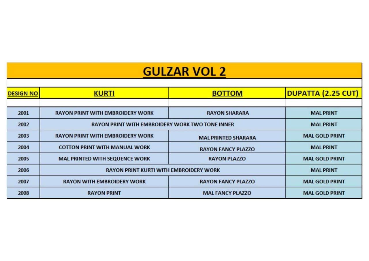 Most Awaited Designer dupatta collection with kurti Plazzo , Sharara set . Its filled With Glitz & Glamour ...! KAJAL STYLE Catalogue name: GULZAR VOL 2 ✨Details Fabrics - ▶Heavy Reyon 14 kg ▶Mal ▶ Embroidery work Size - S(18) M(19) L(20) XL(22) XXL(23) 3xl(24) 4xl(25)  Length --> 46 ☣Designs - 8 pcs Rate ~ 899/-₹ |