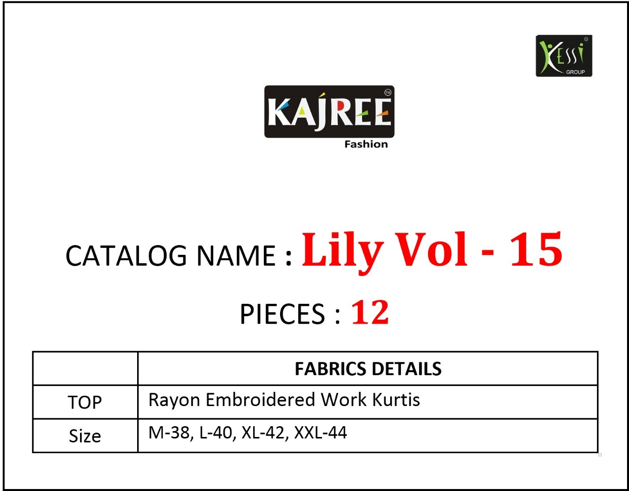Kajree has launched Catalog name : Lily Vol - 15 Fabric Details âªTop:- Rayon with Embroidered work Kurtis âªTotal Design:- 12 âªSize:- M-38, L-40, XL-42, XXL-44 Price-350/- Gst extra 5% â°Dispatching 5 to 6 days later Booking started from now... Order yours soon... |