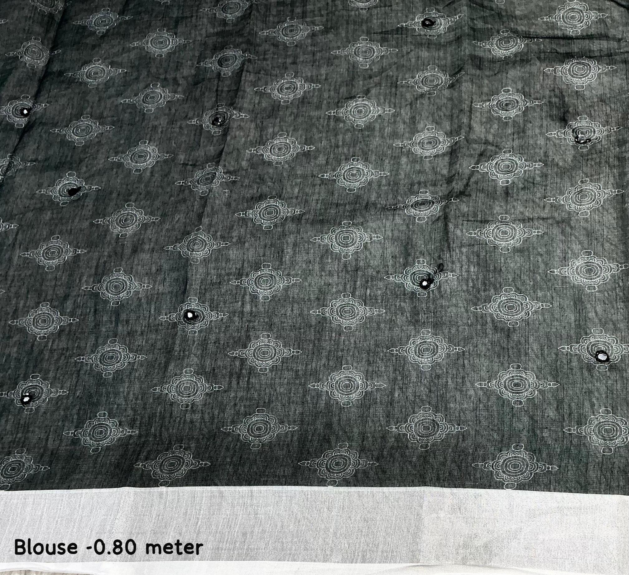 ”Kalakriti Design” New Linen Single colour Edition Quality - Soft Linen Cotton Saree With silver Jari Border & Aari Mirror Work all over saree. Cotton Tassles on pallu. Blouse - Running Aari Work Blouse. Rate - 650+ship Top premium quality |