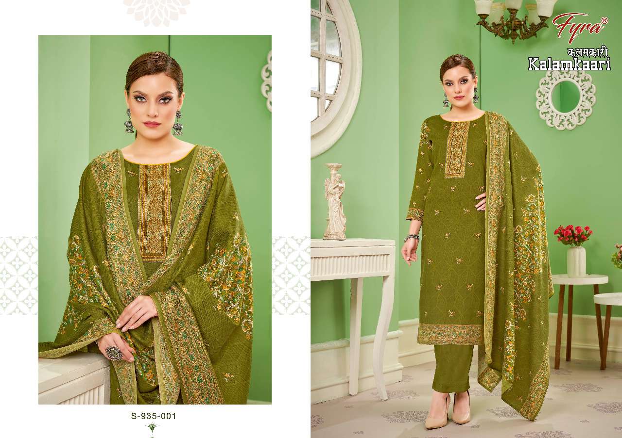 👗 Fyra Designing Hub by Alok Suit - Make in India 👗 Launches its New Catalog: KALAMKAARI Fabric Details: 👖 BOTTOM: Pure Spun Pashmina Dyed 🧣 DUPPATTA: Pure Pashmina Print Dupatta SetRate: 3️⃣4️⃣1️⃣+5️⃣% GST 8️⃣pcs |