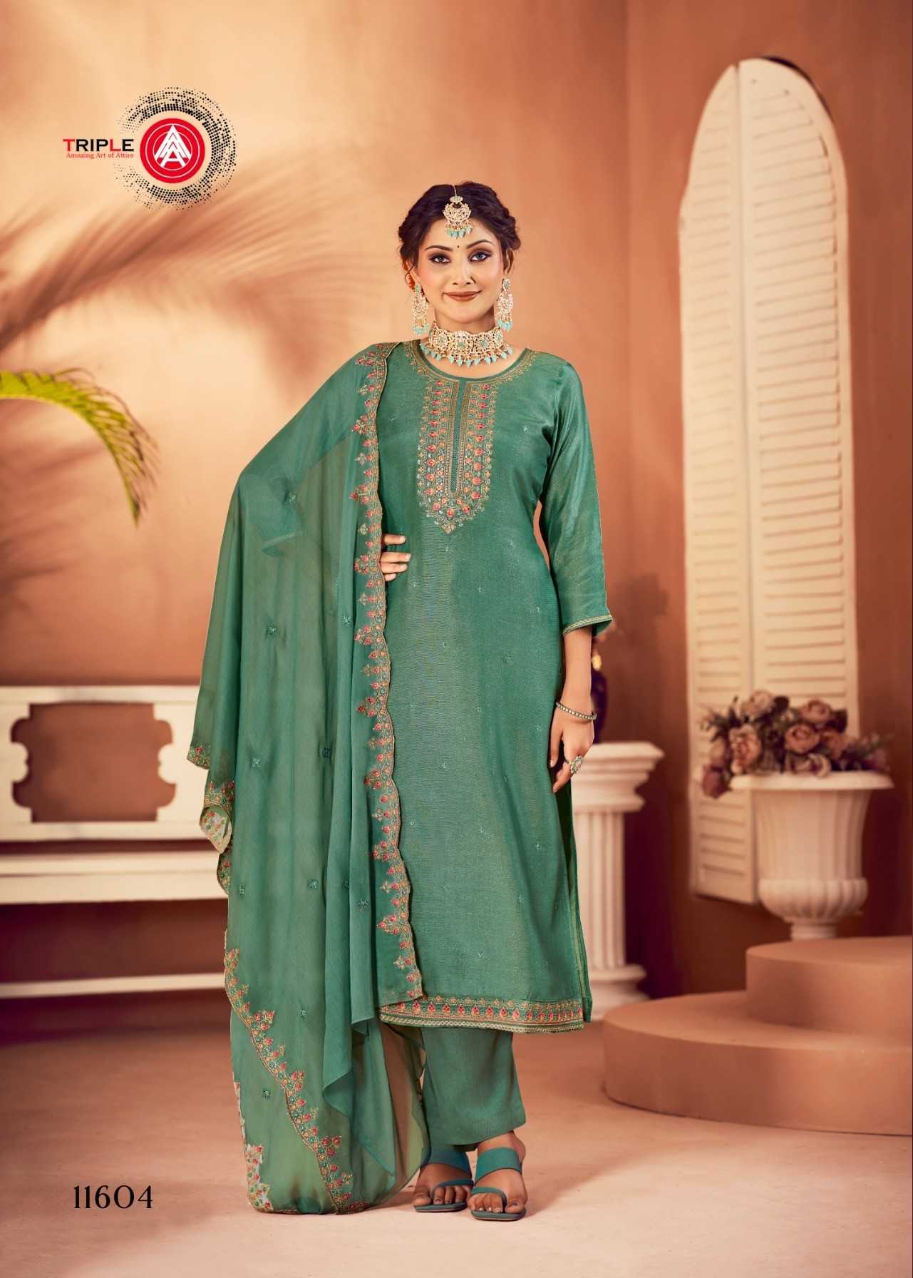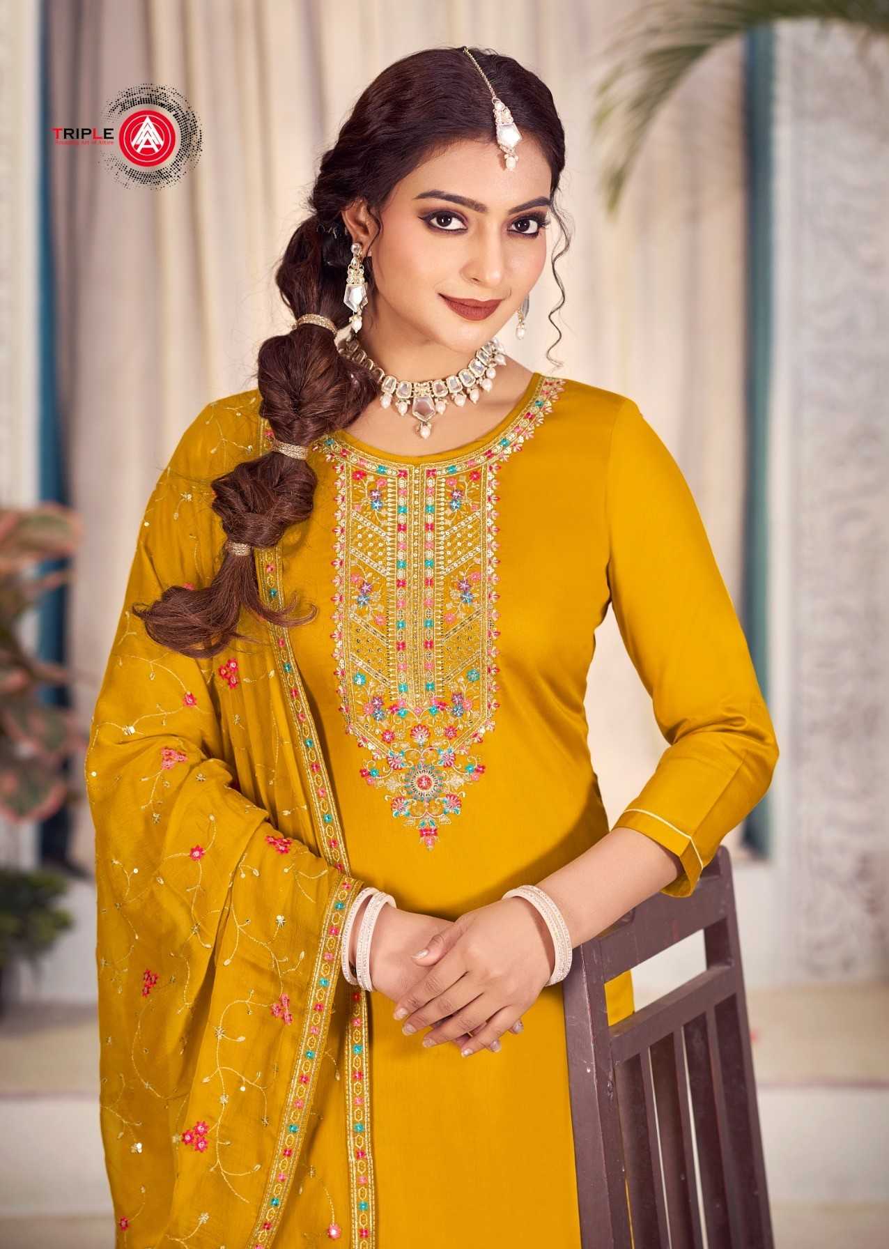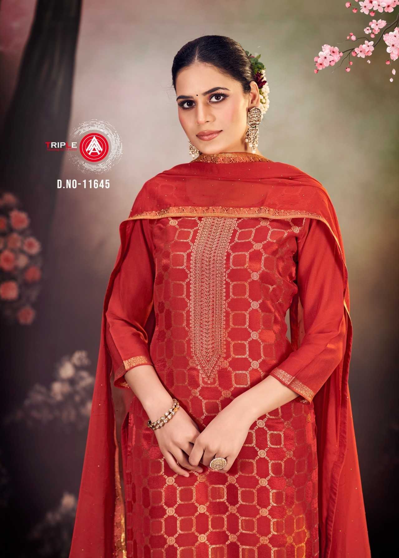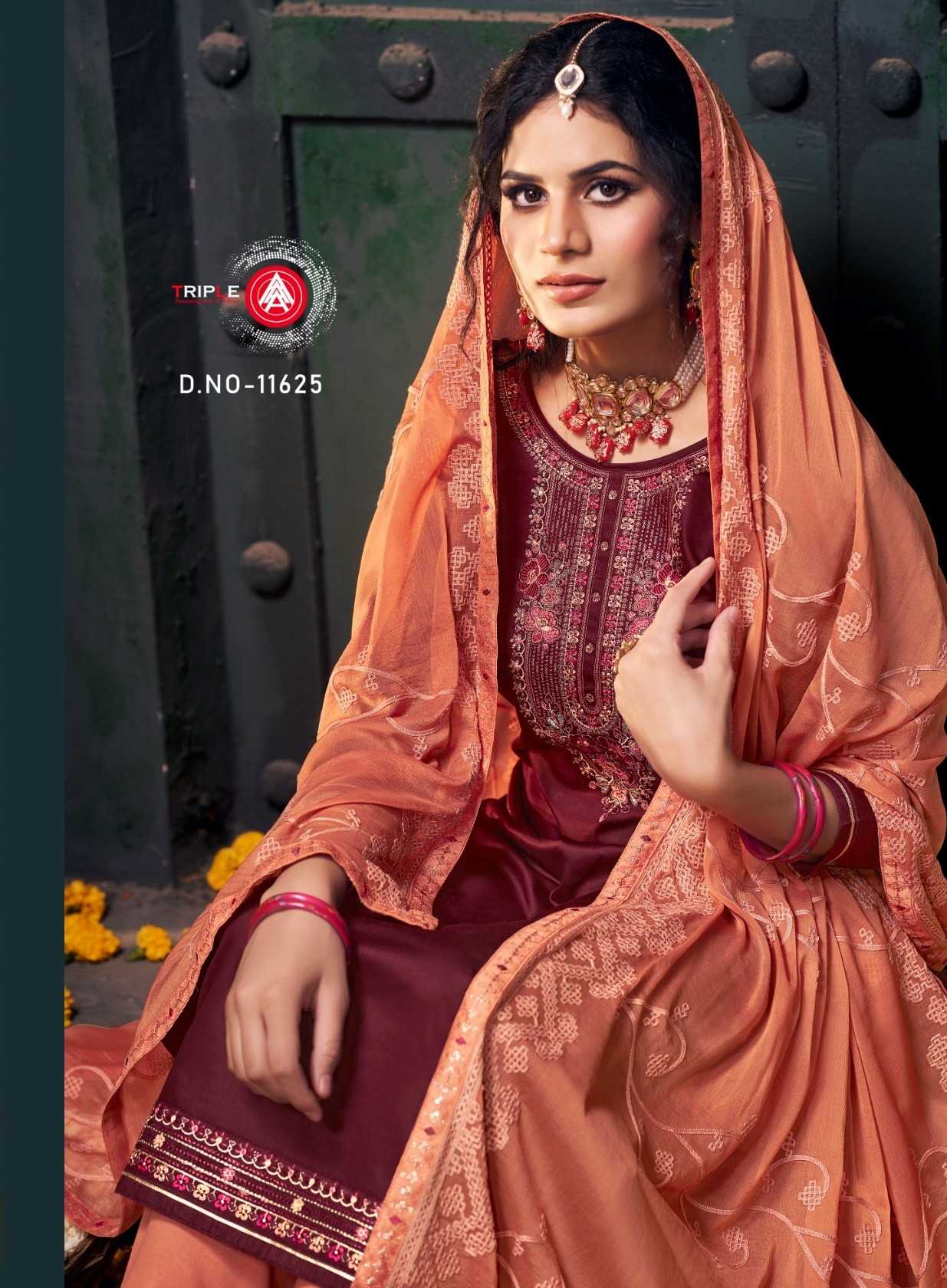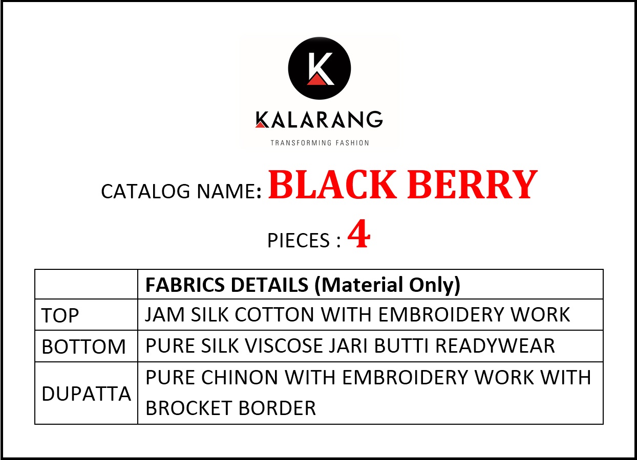 Catalog name : Black BerryFabric Details âªTop:- JAM SILK COTTON WITH EMBROIDERY WORK âªBottom:- PURE SILK VISCOSE JARI BUTTI READYWEAR âªDupatta:- PURE CHINON WITH EMBROIDERY WORK WITH BROCKET BORDER âªTotal Design:- 4 â°Dispatching 5 to 6 days later Rate 999 |