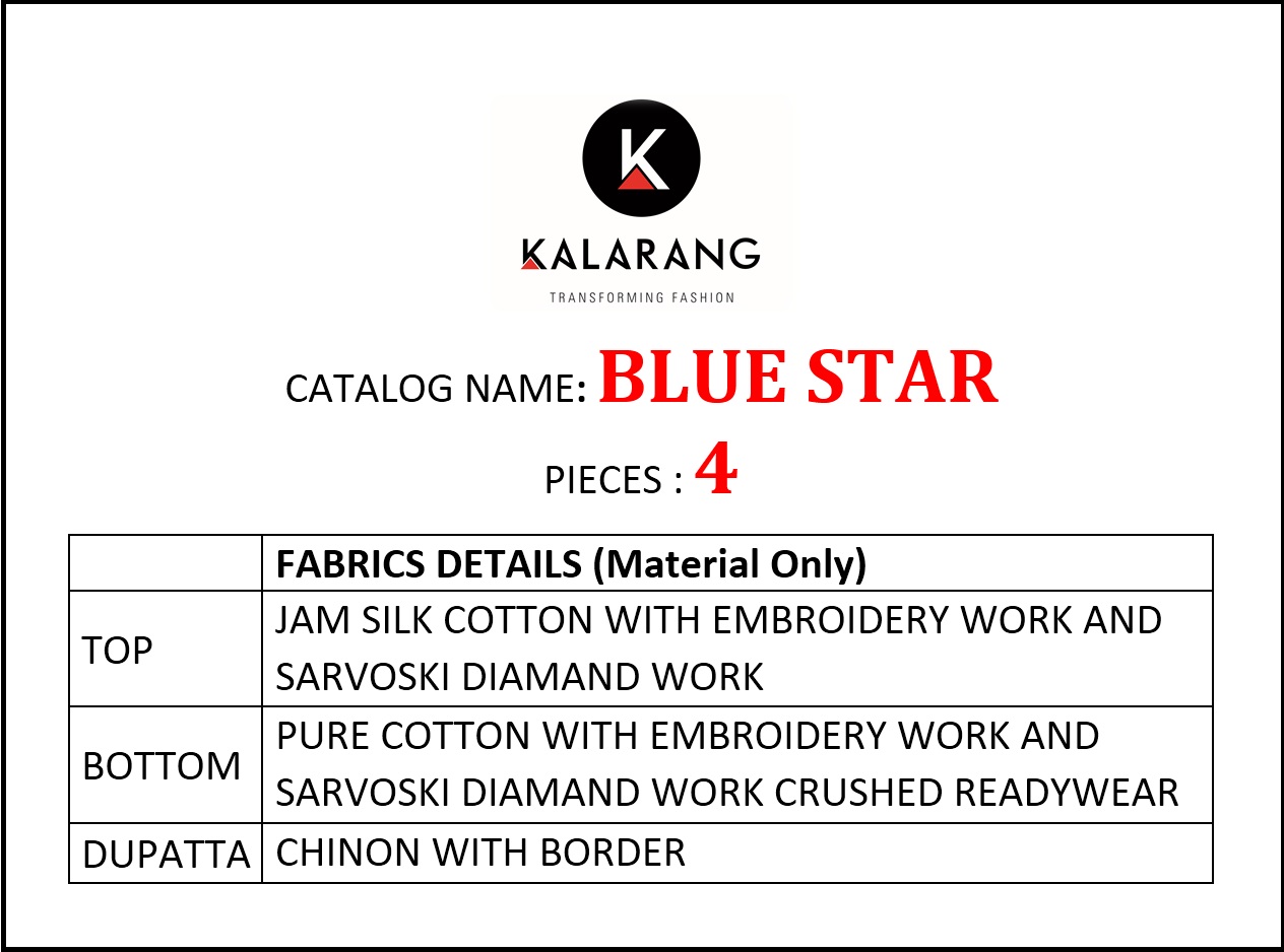 Kalarang. has launched Catalog name : Blue Star Fabric Details ▪Top:- JAM SILK COTTON WITH EMBROIDERY WORK AND SARVOSKI DIAMOND WORK ▪Bottom:- PURE COTTON WITH EMBROIDERY WORK AND SARVOSKI DIAMOND WORK CRUSHED READYWEAR ▪Dupatta:- CHINON WITH BORDER ▪Total Design:- 4 Rate 999 |