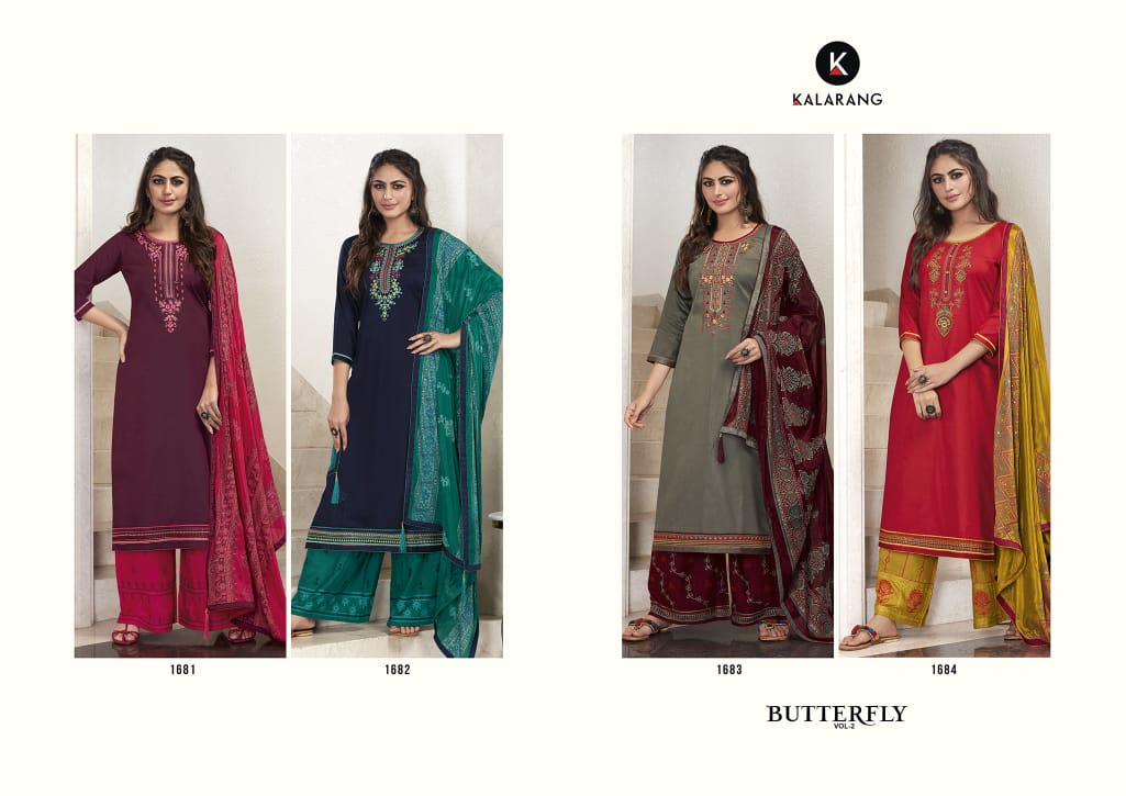 📌 KALARANG has launched Catalog name : * BUTTERFLY VOL-2* 🔸 Fabric Details 🔸 👚Top:- Jam Silk Cotton With Embroidery Work 👖Bottom:- Reyon With Emboidery Work 🧣Dupatta:- Chinon With Foil Print 👜Total Design:- 4 Rate - 775 per pcs . Set to set ⏰Dispatching 5 to 6 days later |