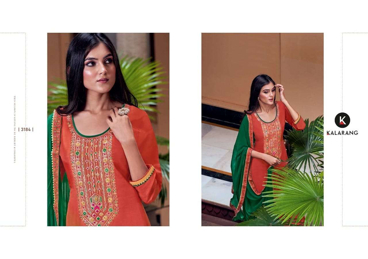 * KALARANG  has launched  Catalog name :  GAURIKA Fabric Details Top:- Pure Viscose Upada Silk With Heavy Embroidery Work Bottom:- Heavy Dull Shantoon Dupatta:- Pure German Dupatta With Four Side Lace Work           Total Design:- 4  Rate:- 1075/- per pcs Set to set Dispatching 5 to 6 days later |