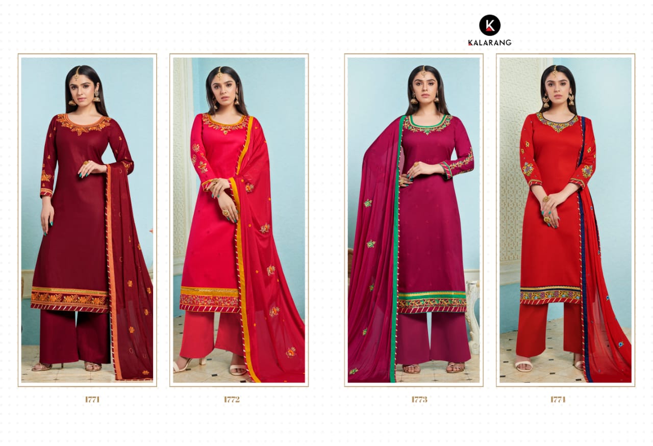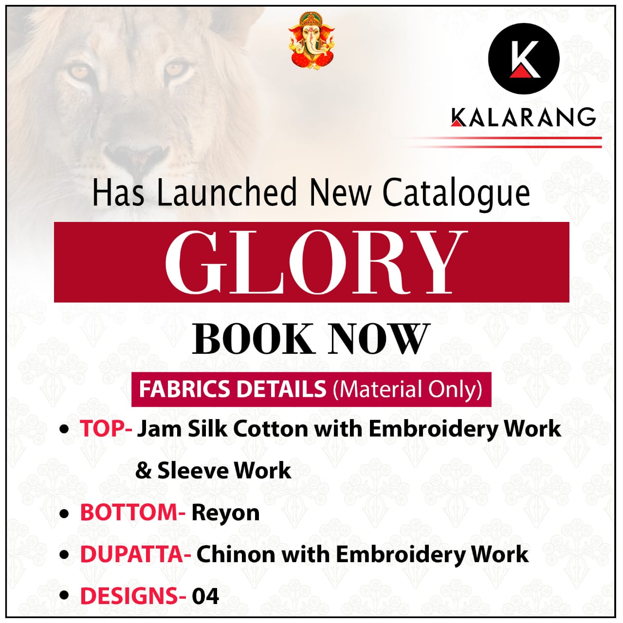 📌 KALARANG has launched Catalog name : * GLORY * 🔸 Fabric Details 🔸 👚Top:- Jam Silk Cotton With Embroidery Work & Sleeve Work 👖Bottom:- Reyon 🧣Dupatta:- Chinon With Embroidery Work 👜Total Design:- 4 Rate 799 |
