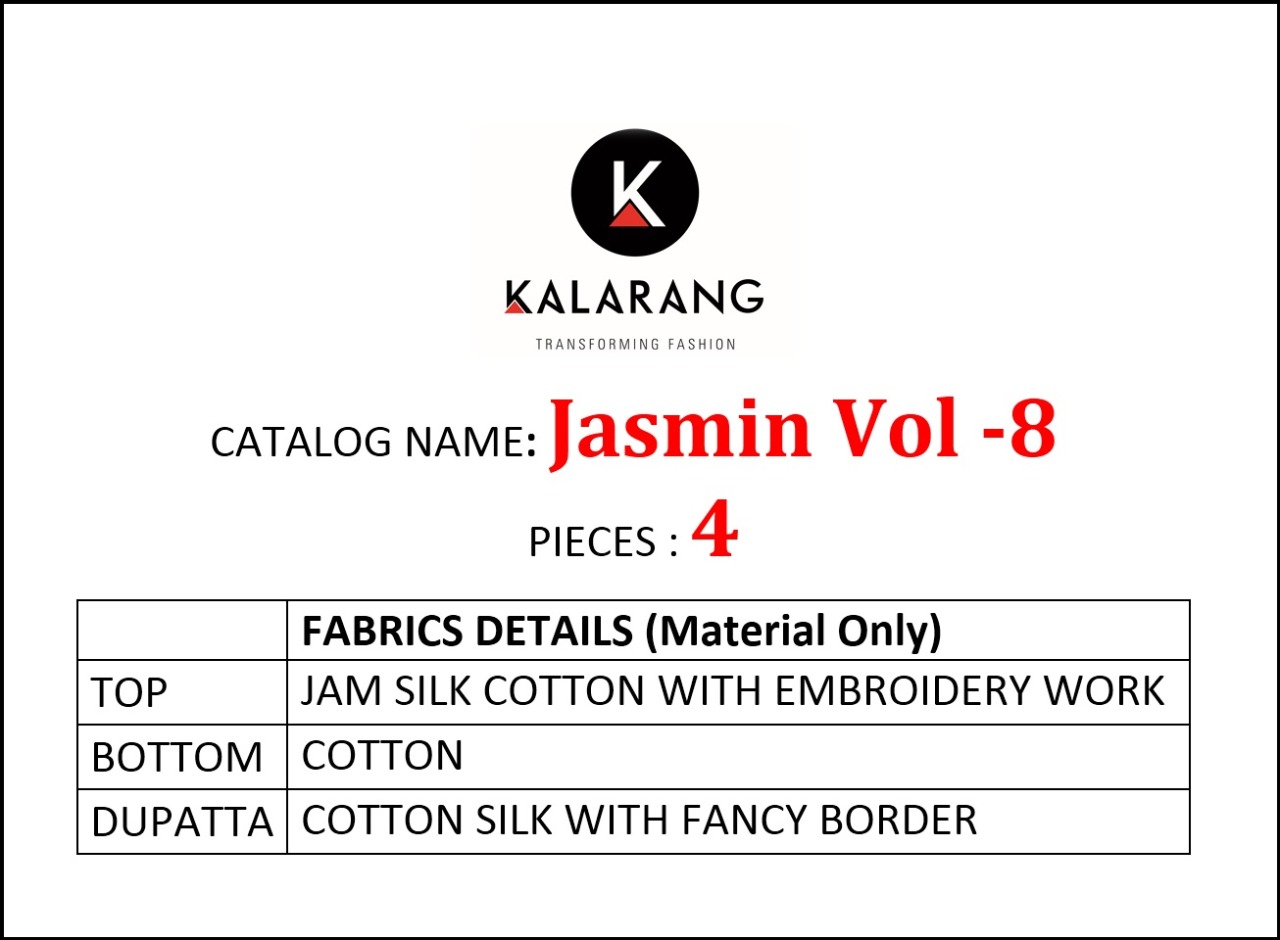 Kalarang. has launched Catalog name : Jasmine Vol - 8 Fabric Details âªTop:- JAM SILK COTTON WITH EMBROIDERY WORK âªBottom:- COTTON âªDupatta:- COTTON SILK WITH FANCY BORDER âªTotal Design:- 4 â°Dispatching 5 to 6 days later 750+GST |