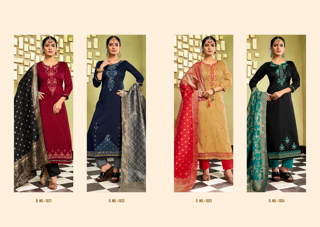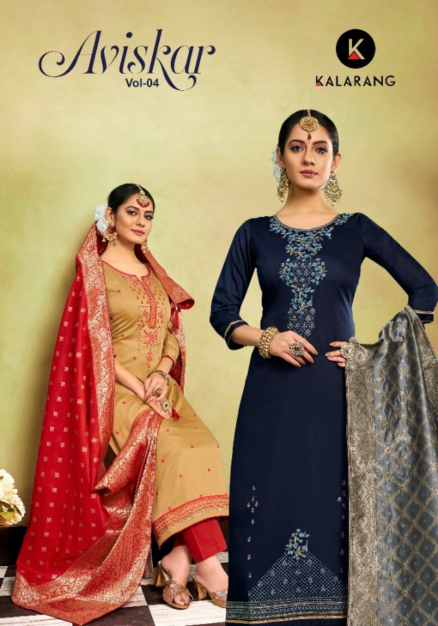 Kalarang. has launched Catalog name : Avishkar Vol - 4 Fabric Details âªTop:- JAM SILK COTTON WITH EMBROIDERY WORK âªBottom:- COTTON âªDupatta:- SILK JACQUARD âªTotal Design :- 4 â°Dispatching 5 to 6 days later Rate 999/. Booking started from now... Order yours soon.. |