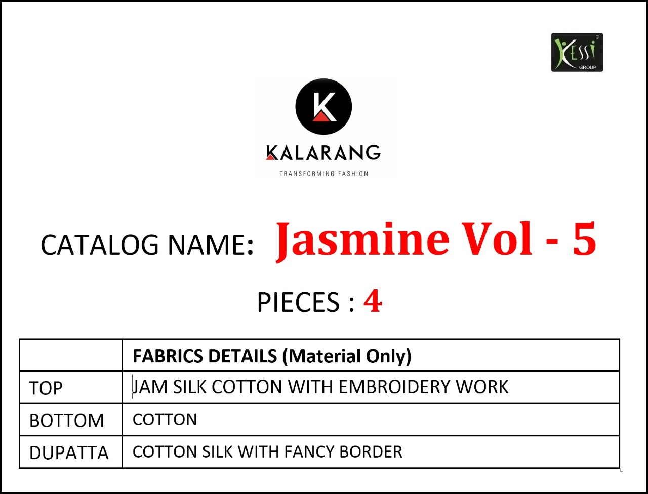 Kalarang. has launched Catalog name : Jasmine Vol - 5 Fabric Details âªTop :- JAM SILK COTTON WITH EMBROIDERED WORK âªBottom:- COTTON âªDupatta:- COTTON SILK WITH FANCY BORDER âªTotal Design :- 4 Rate -750 per pcs . Set To Set : GST 5 Percent Extra â°Dispatching 5 to 6 days later |