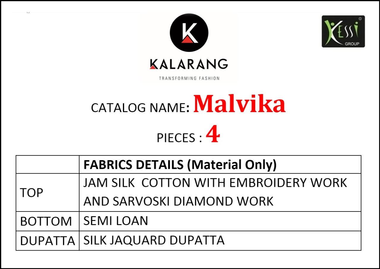 Kalarang. has launched Catalog name : Malvika Fabric Details ▪Top:- JAM SILK COTTON WITH EMBROIDERY WORK AND SARVOSKI DIAMOND ▪Bottom:- SEMI LOAN ▪Dupatta:- SILK JAQUARD DUPATTA ▪Total Design:- 4 Rate 899 |