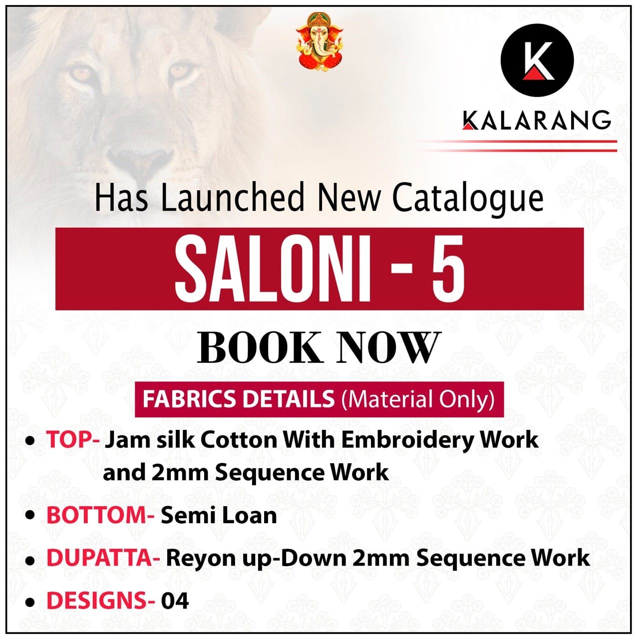 📌 KALARANG has launched Catalog name : * SALONI VOL-5 * 🔸 Fabric Details 🔸 👚Top:- Jam Silk Cotton With Embroidery Work And 2MM Sequence Work 👖Bottom:- Semi Loan 🧣Dupatta: Reyon Up-Down 2MM Sequence Work 👜Total Design:- 4 Rate 775/. ⏰Dispatching 5 to 6 days later |