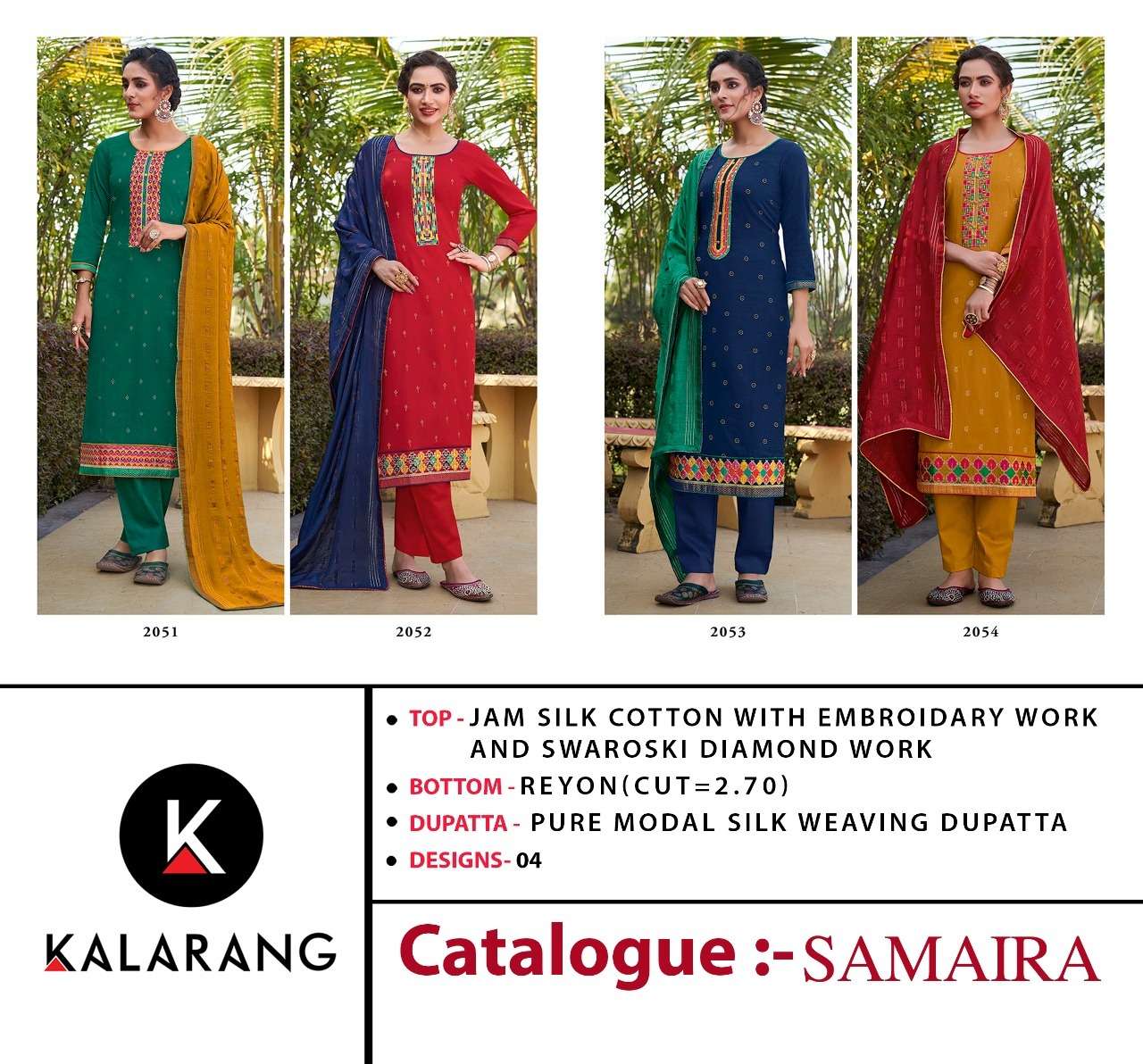 .. * KALARANG  has launched  Catalog name :  * SAMAIRA* Fabric Details Top:- Jaam Silk Cotton With Embroidery Work And Swaroski Dimond Work Bottom:- Reyon (Cut=2.70) Dupatta:- Pure Modal Silk Weaving Dupatta           Total Design:- 4  Rate:-885 |