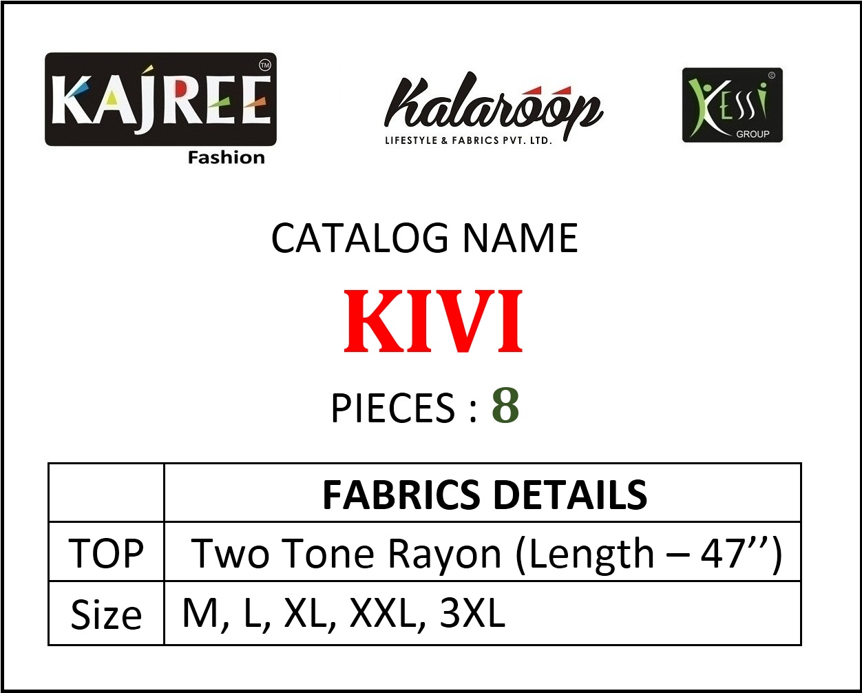 Kalaroop by Kajree has launched Catalog name: KIVI Fabric Details ▪Top:- Two Tone Rayon (Length-47) ▪Total Design:- 8 ▪Size:- M, L, XL, XXL, 3XL Rate 341/- |