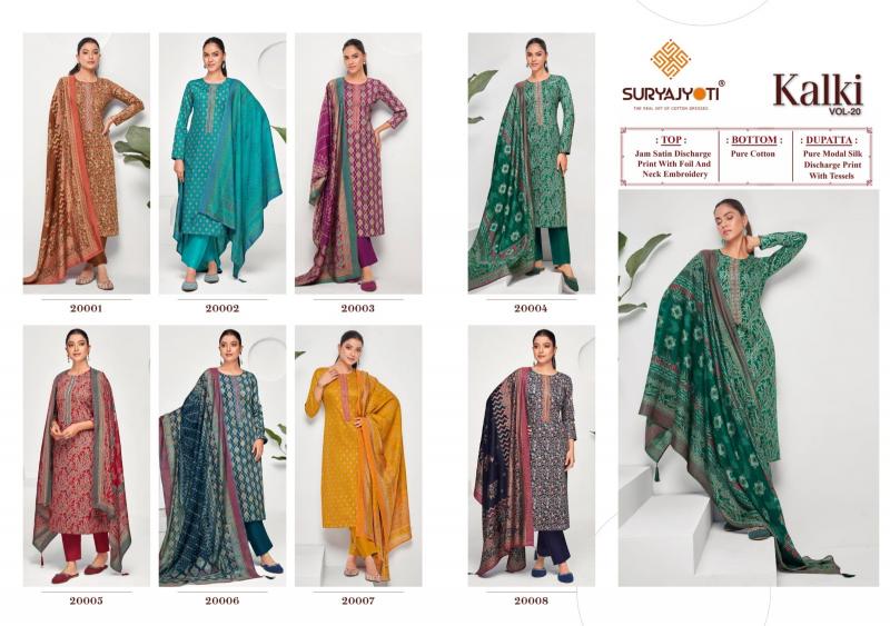 DEAR CUSTOMER WELCOME TO SURYAJYOTI LAUNCHING OF SURYAJYOTI’S NEW FANCY PRINT CATALOG 📕CATALOGUE- KALKI VOL-20 👚TOP- JAAM SATIN DISCHARGE PRINT WITH FOIL AND NECK EMBROIDERY 👖BOTTOM- PURE COTTON 🧣DUPATTA- PURE MODAL SILK DISCHARGE PRINT WITH TESSELS CUT- 2.50-2.50–2:25 RATE- 765/ PACKING- EXCLUSIVE POUCH PACK WITH BAG🧳 |