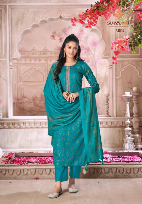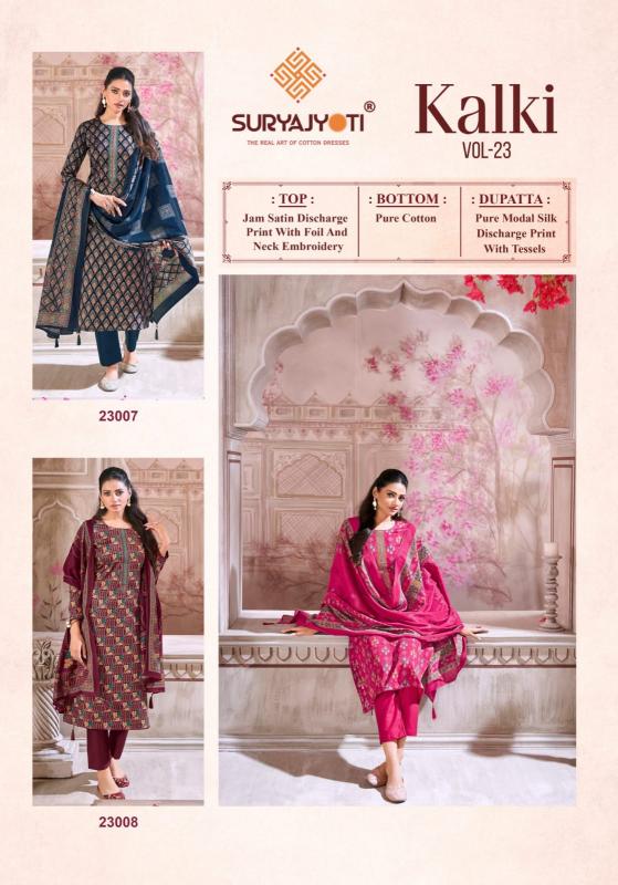 DEAR CUSTOMER WELCOME TO SURYAJYOTI LAUNCHING OF SURYAJYOTI’S NEW FANCY PRINT CATALOG 📕CATALOGUE- KALKI VOL-23 👚TOP- JAAM SATIN DISCHARGE PRINT WITH FOIL AND NECK EMBROIDERY 👖BOTTOM- PURE COTTON 🧣DUPATTA- PURE MODAL SILK DISCHARGE PRINT WITH TESSELS CUT- 2.50-2.50–2.25 💸RATE- 761/- 💼PACKING- EXCLUSIVE POUCH PACK WITH BAG REMARK: BOOKING OPEN FOR LIMITED PERIOD ONLY |