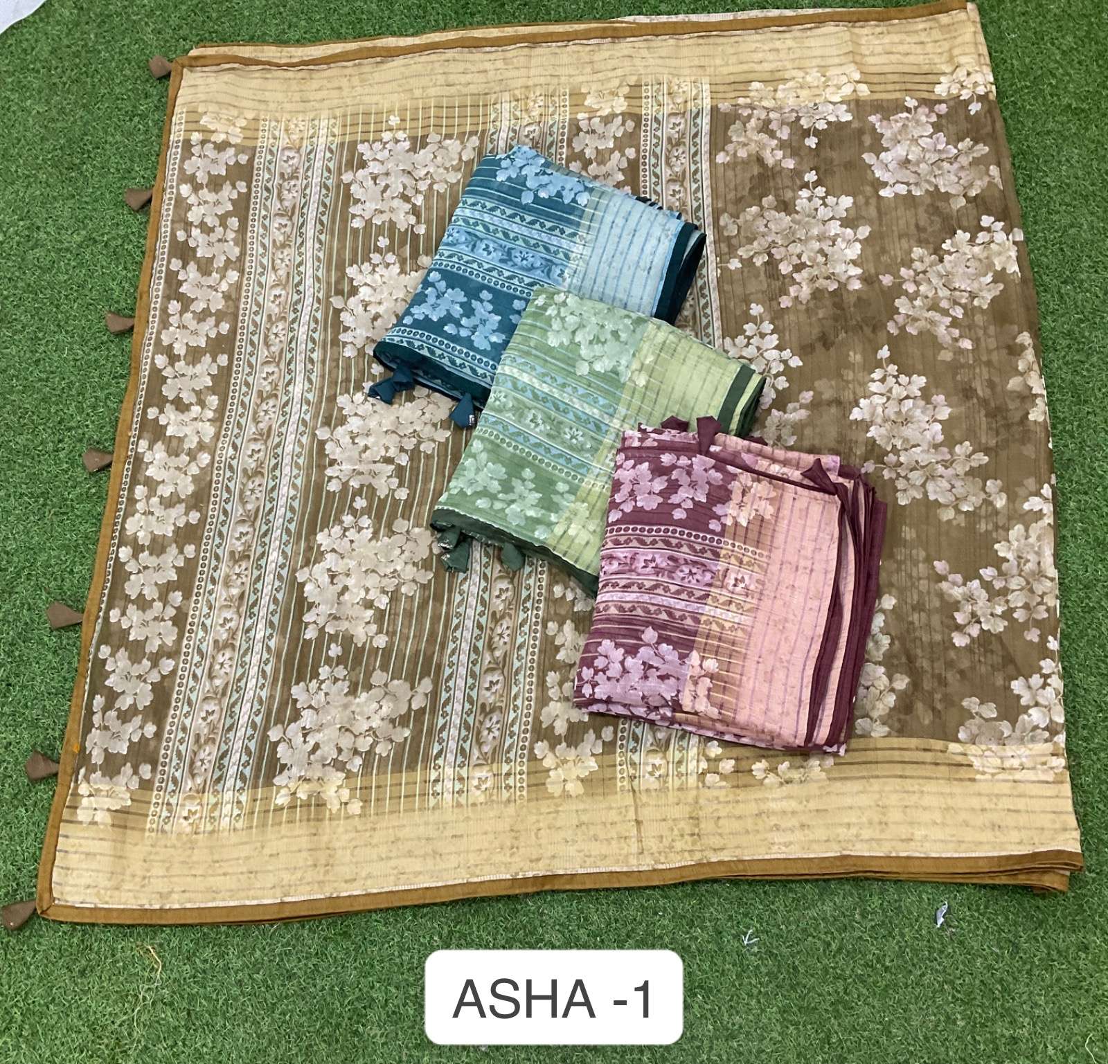 Asha 01 no. -580/- Fabric: Nilgiri chiffon Concept: Print design with flower pattern Blouse:Butti blouse 🔥Hit design in asha catalog💃 Packing : 05/09/2023 📌 |