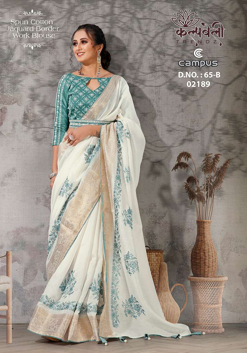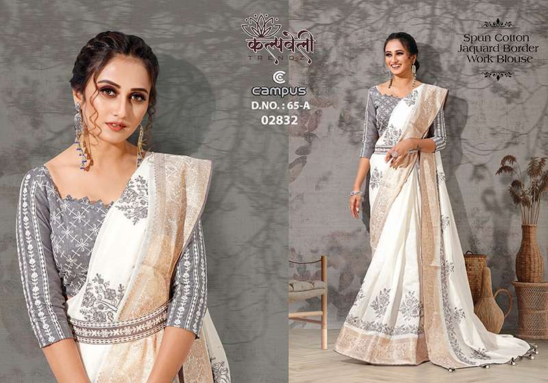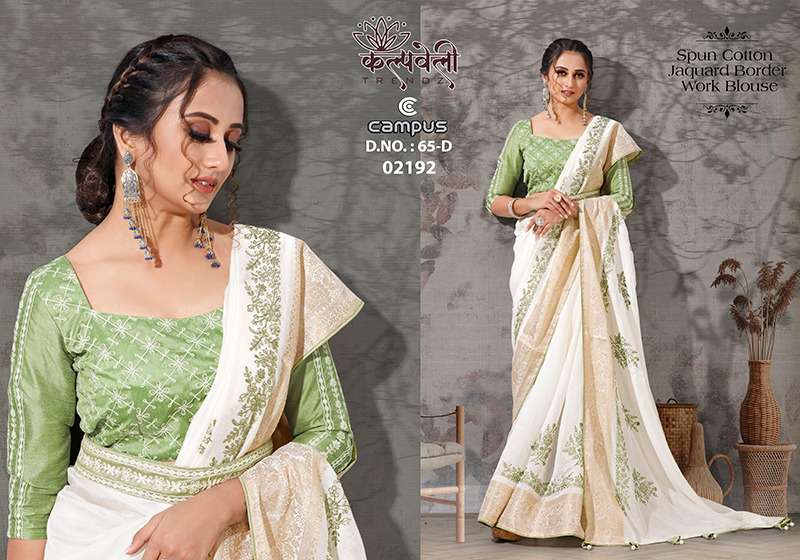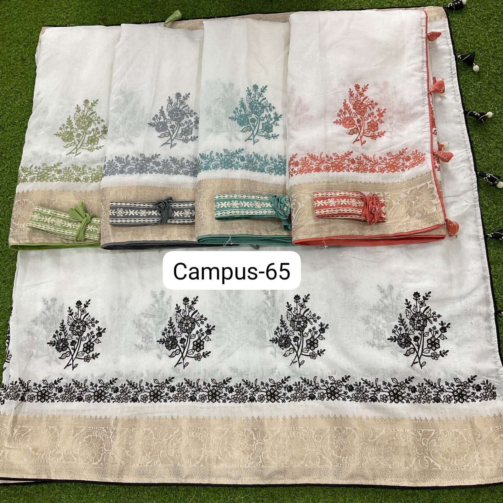 Campus 65 no. -1150/- Fabric: Spun cotton Concept: Beautiful embroidery work on white saree with work belt Blouse: Work blouse |