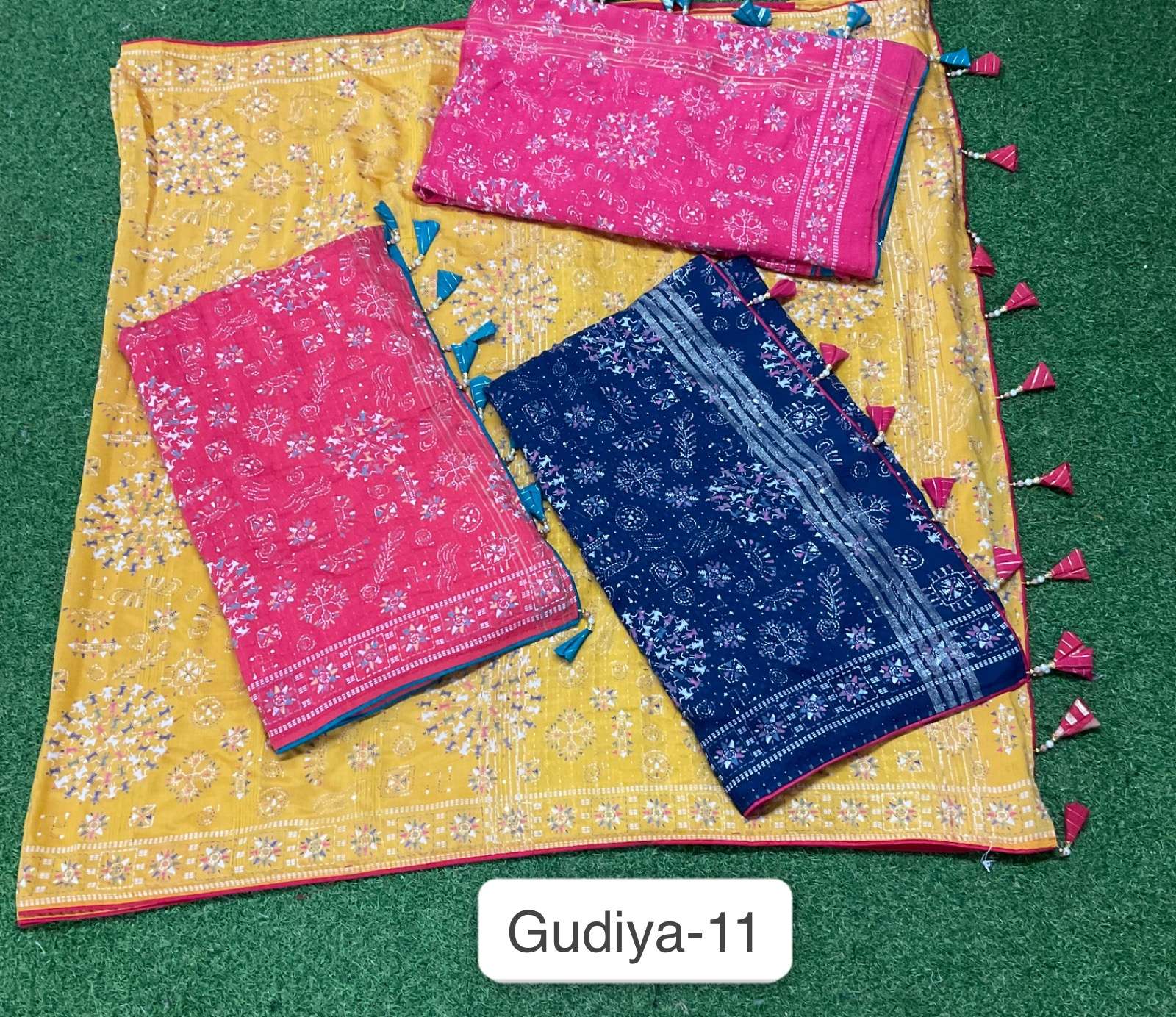 Gudiya 11 no. -1111/- Fabric: Soft muslin Concept: Beautiful viscose pallu with work Blouse:Contrast matching blouse Packing : 05/09/2023 📌 |