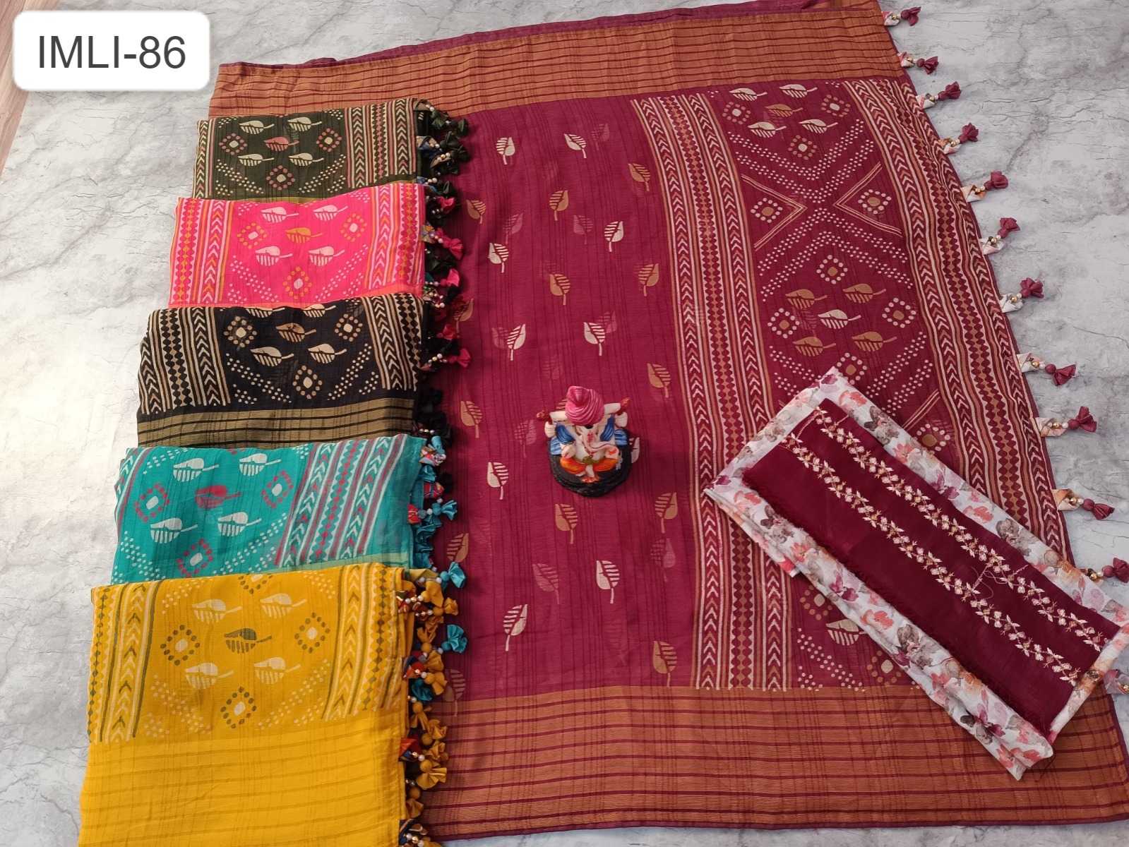 imli - 86 no. -799/- Fabric: nilgiri chiffon Concept: jari lining Patti print design in saree Blouse: print blouse |