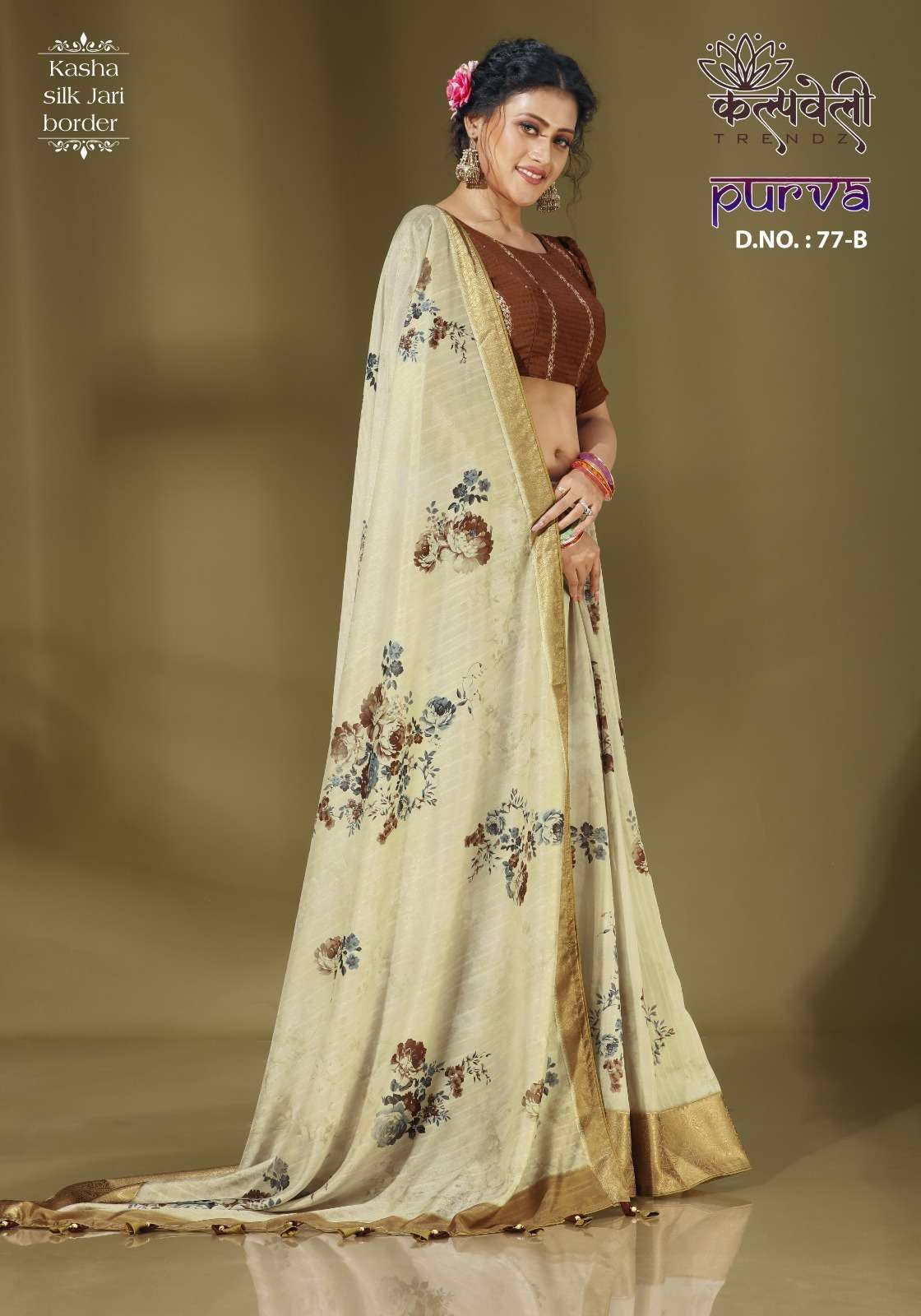 Purva 77 no. -999/- Fabric: Kasha silk Concept:Beautiful flowers print with jari border Blouse: Matching blouse Packing : 29.09.2023📌 |