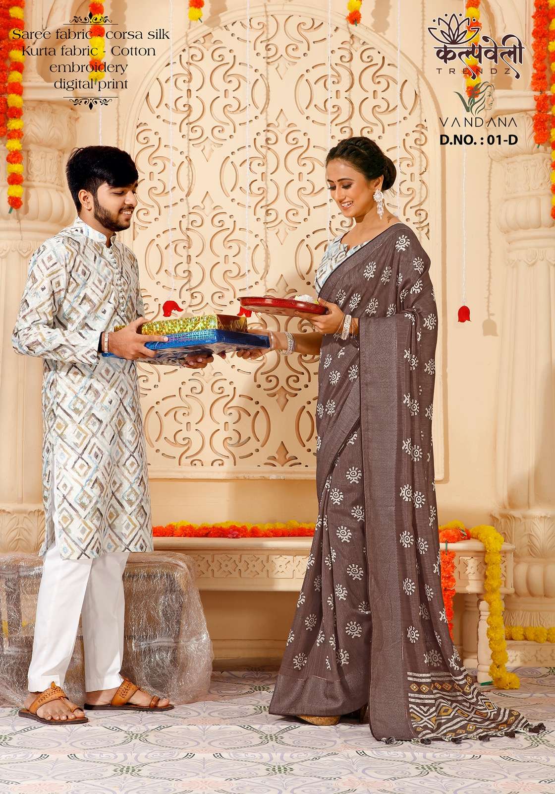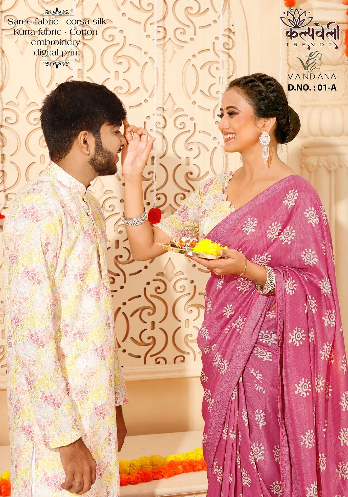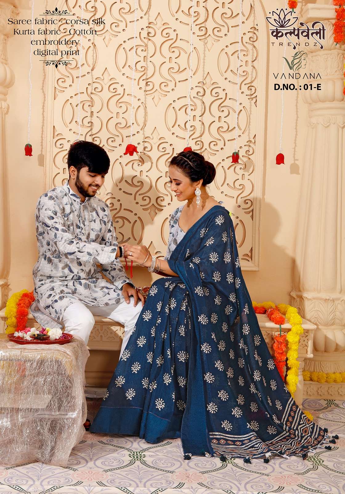 Rakhi special matching pair👫👫👫 Vandana 01 no. -1399/- Fabric: corsa silk Concept: Beautiful print saree in corsa silk 🔥*including saree with matching Cotton kurta fabric💥 (3 mtr Unstitched)😍 embroidery kurta fabric💃 Blouse: cotton blouse