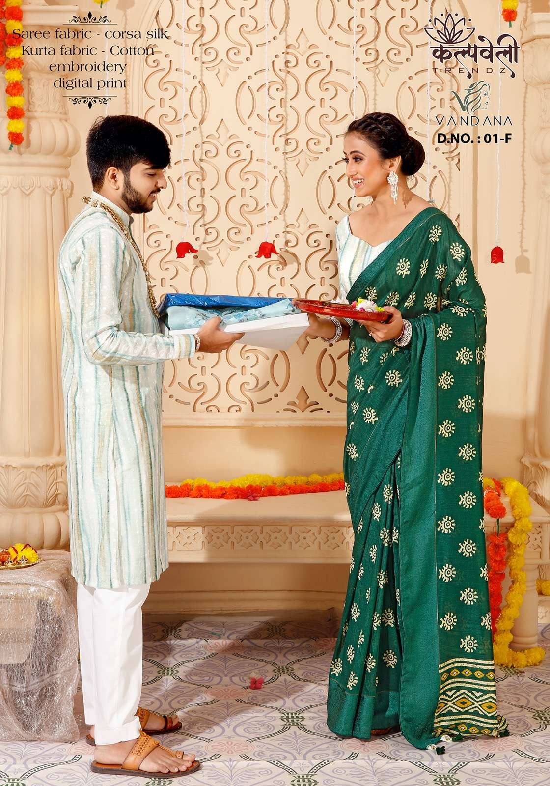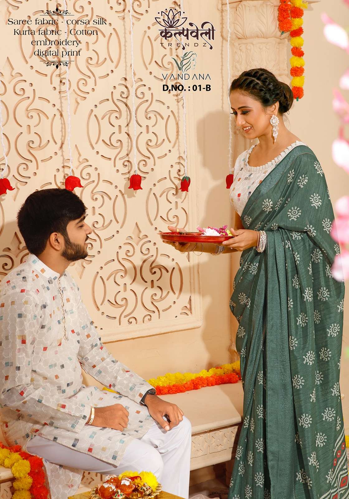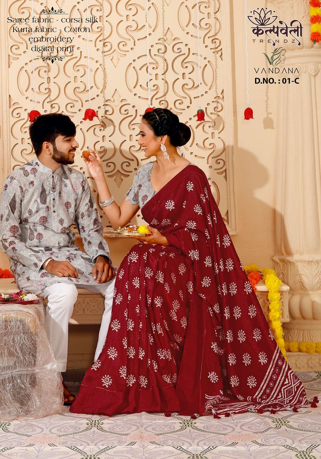 Rakhi special matching pair👫👫👫 Vandana 01 no. -1399/- Fabric: corsa silk Concept: Beautiful print saree in corsa silk 🔥*including saree with matching Cotton kurta fabric💥 (3 mtr Unstitched)😍 embroidery kurta fabric💃 Blouse: cotton blouse