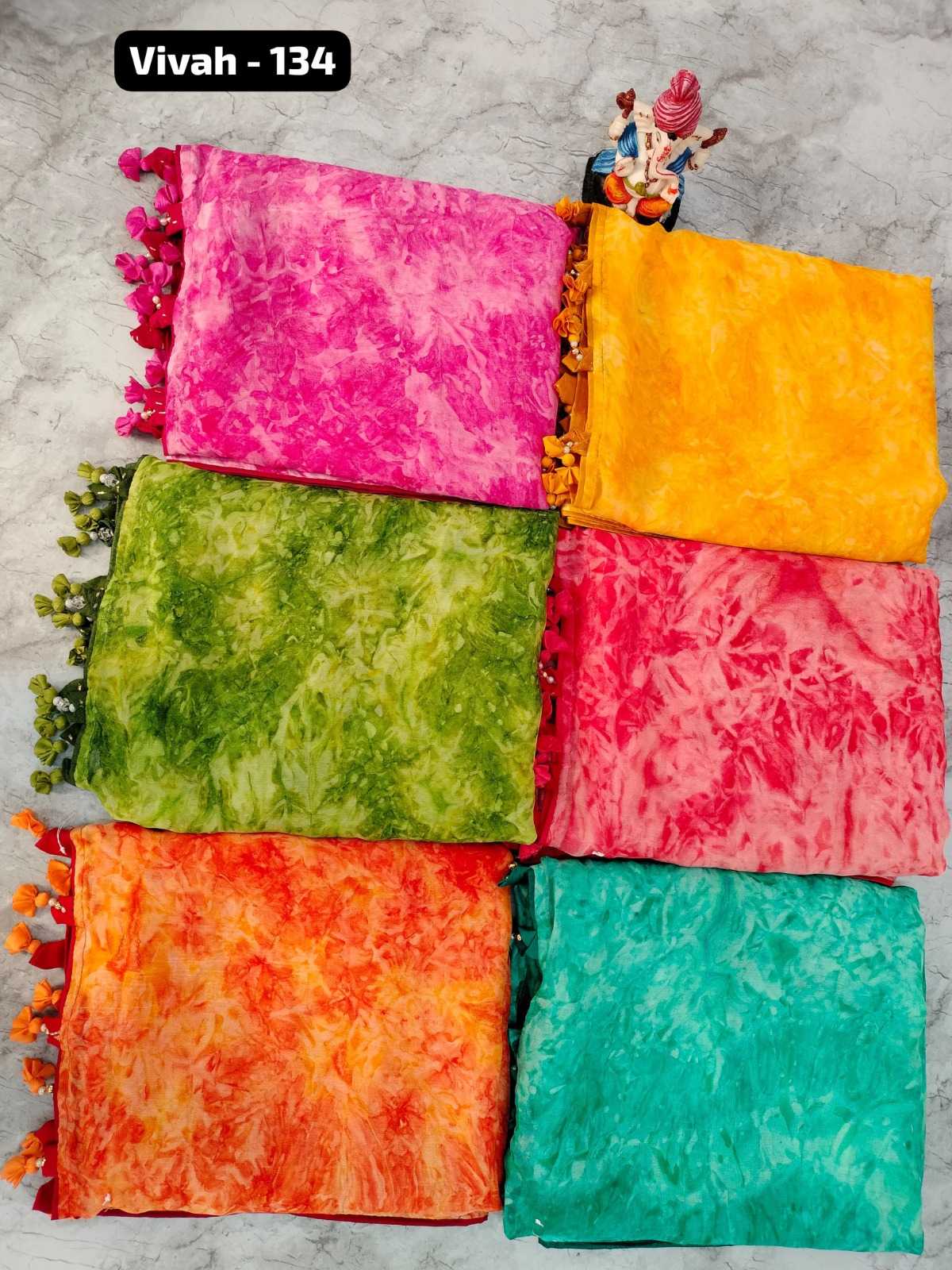 Vivah 134 no. -765/- Fabric: Simmer chiffon saree Concept: Exclusive fancy border saree with matching blouse New collection💃 6 colors🎨 available Blouse:Matching dyed blouse Packing : 16/10/2023 📌 |