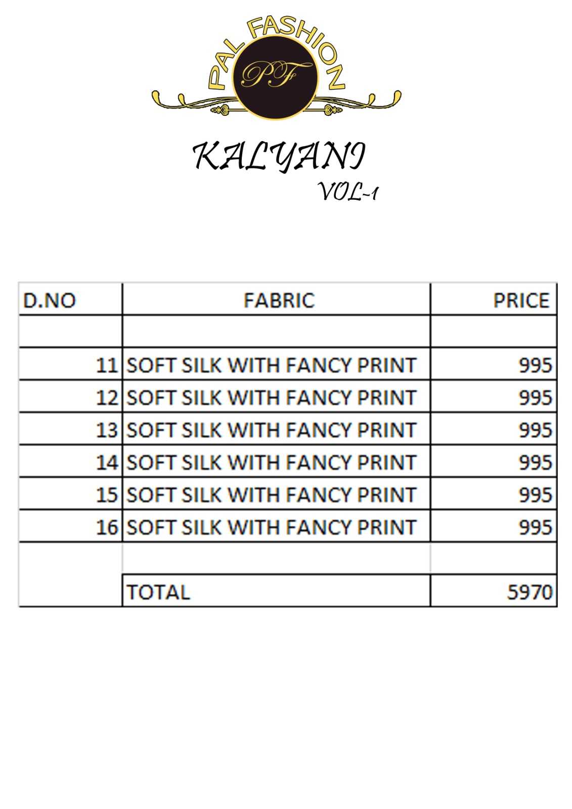 Brand name: PAL FASHION " KALYANI VOL 1" soft silk 995/- |