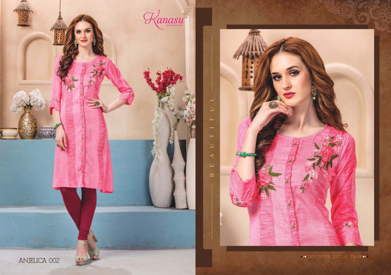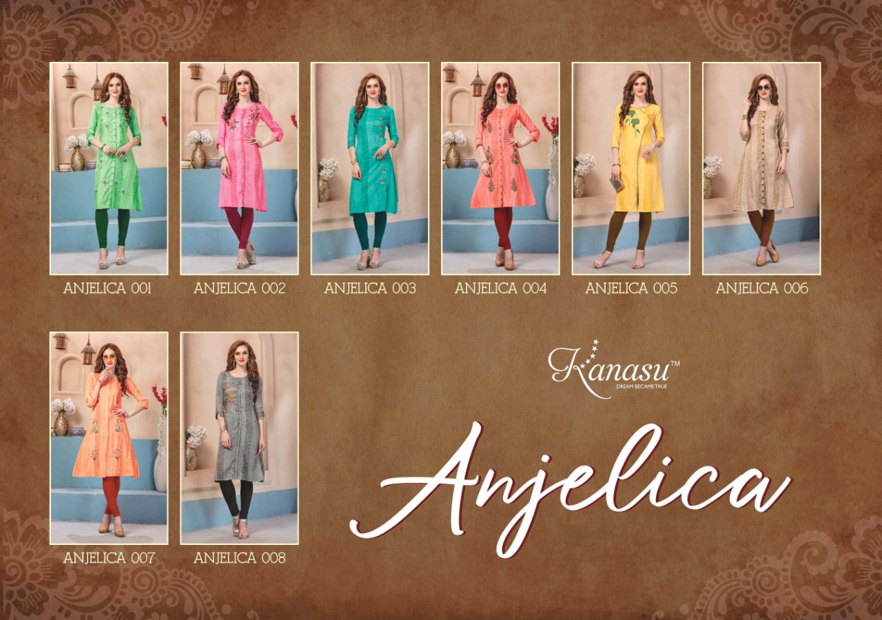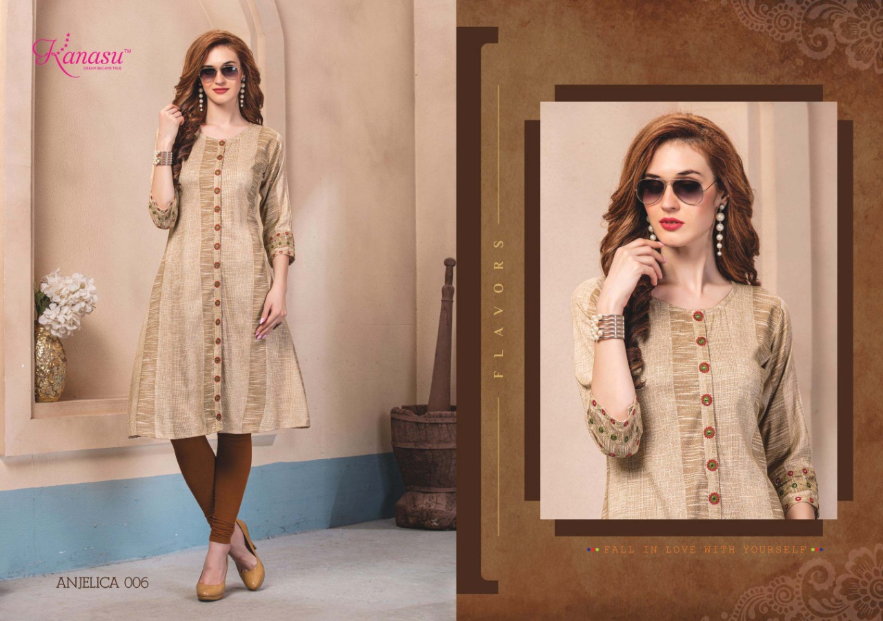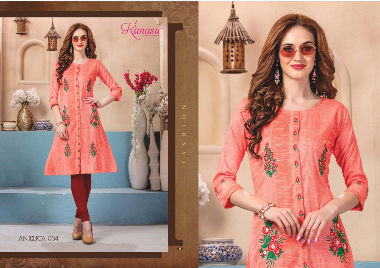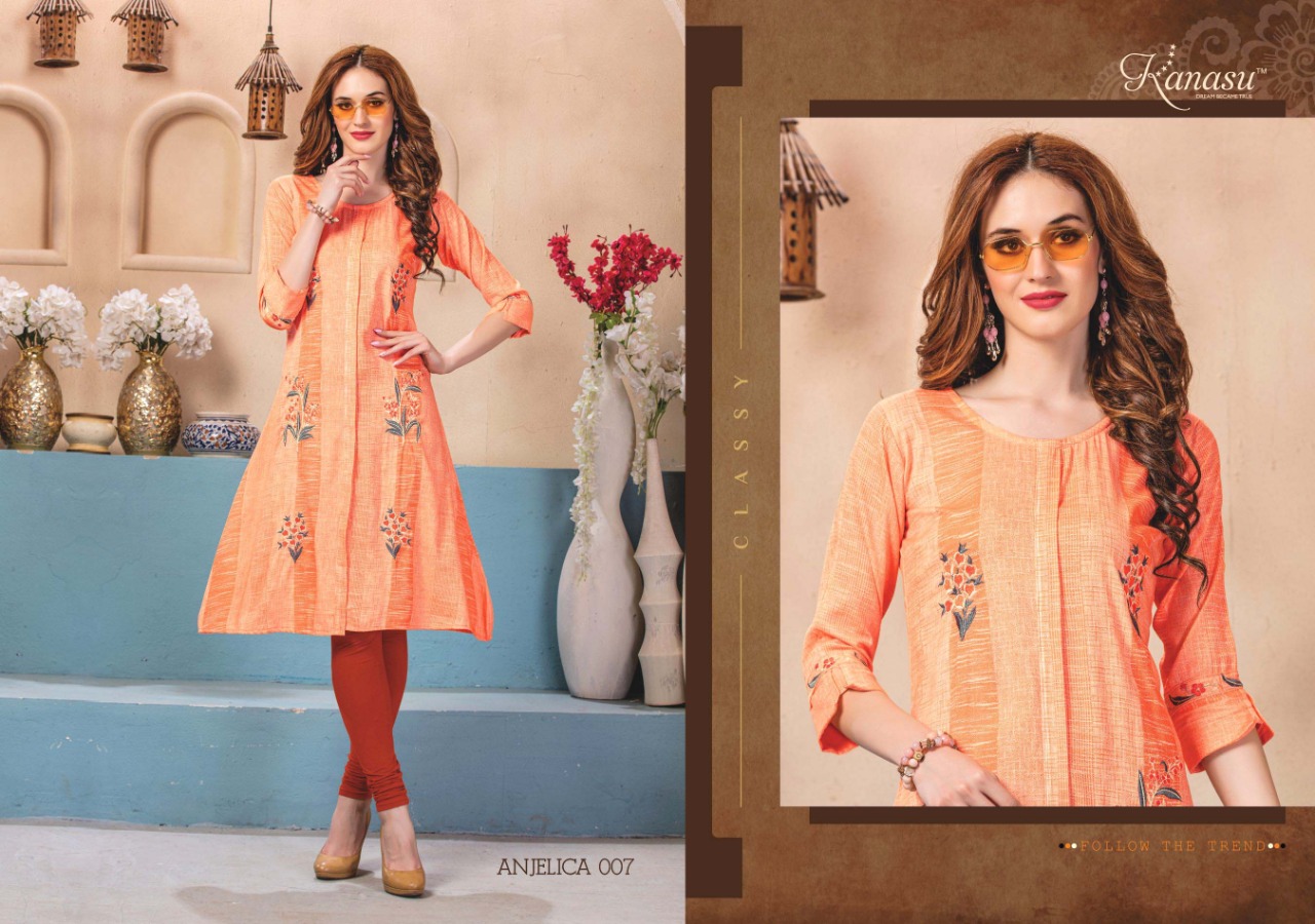 Dear Customers, Welcome to KANASU (KURTI) .., We are introducing KANASU new catalog Catalogue:- ANJELICA cloth :- COTTON STRIPES â Concept A-LINE WITH WORK PATTERN Length :- 46â MINIMUM Size:- *M L XL XXL 3XL * AVAILABLE 8 DESIGNS CATALOGUE RATE:- 510/- à: Dispatch :- READY THANKING YOU KANASU |