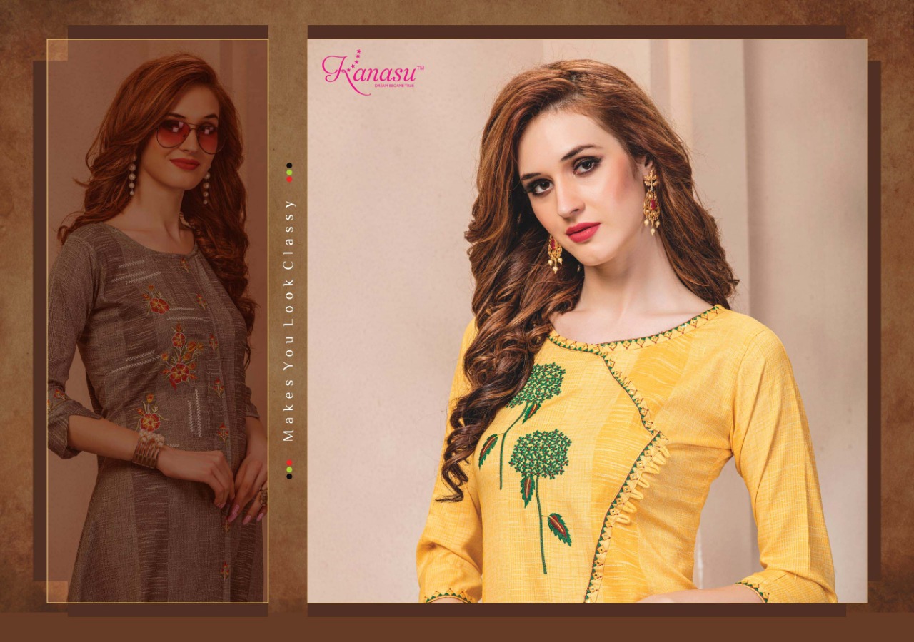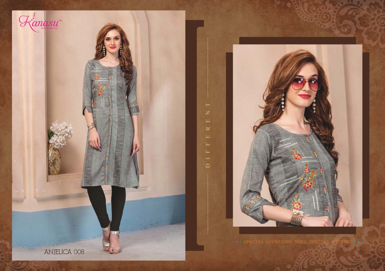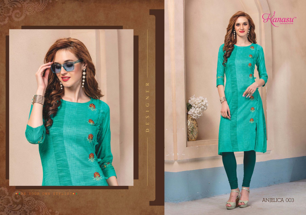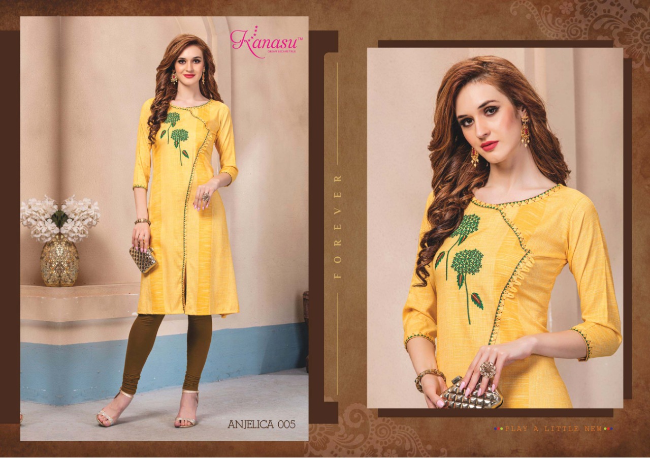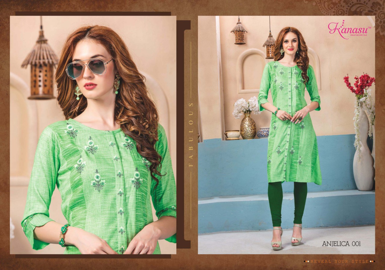 Dear Customers, Welcome to KANASU (KURTI) .., We are introducing KANASU new catalog Catalogue:- ANJELICA cloth :- COTTON STRIPES â Concept A-LINE WITH WORK PATTERN Length :- 46â MINIMUM Size:- *M L XL XXL 3XL * AVAILABLE 8 DESIGNS CATALOGUE RATE:- 510/- à: Dispatch :- READY THANKING YOU KANASU |
