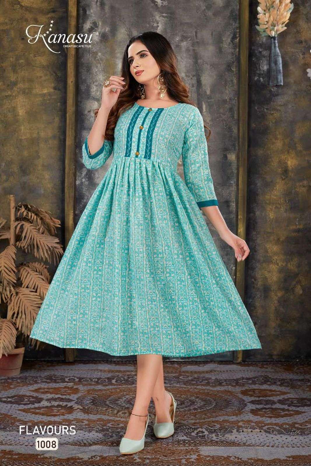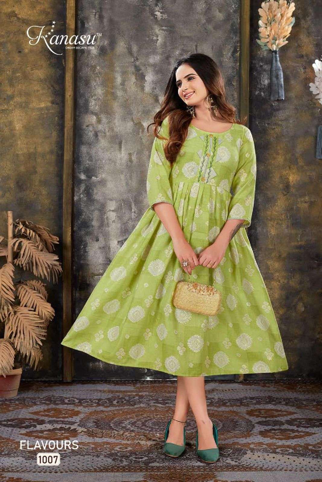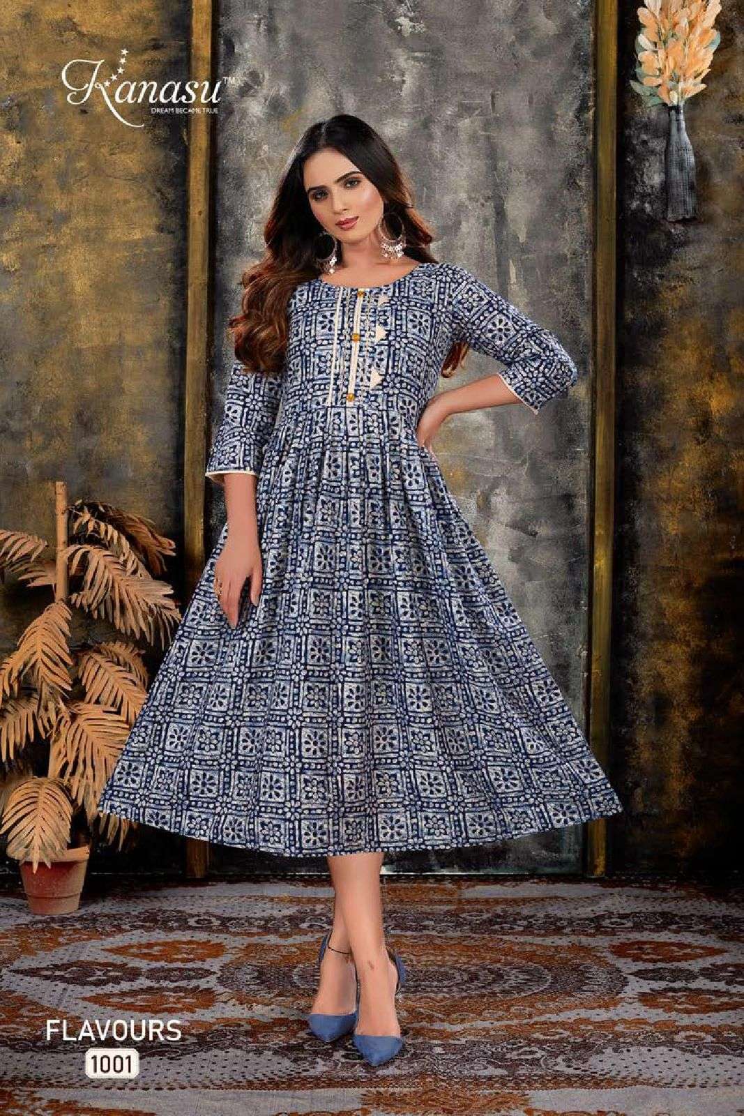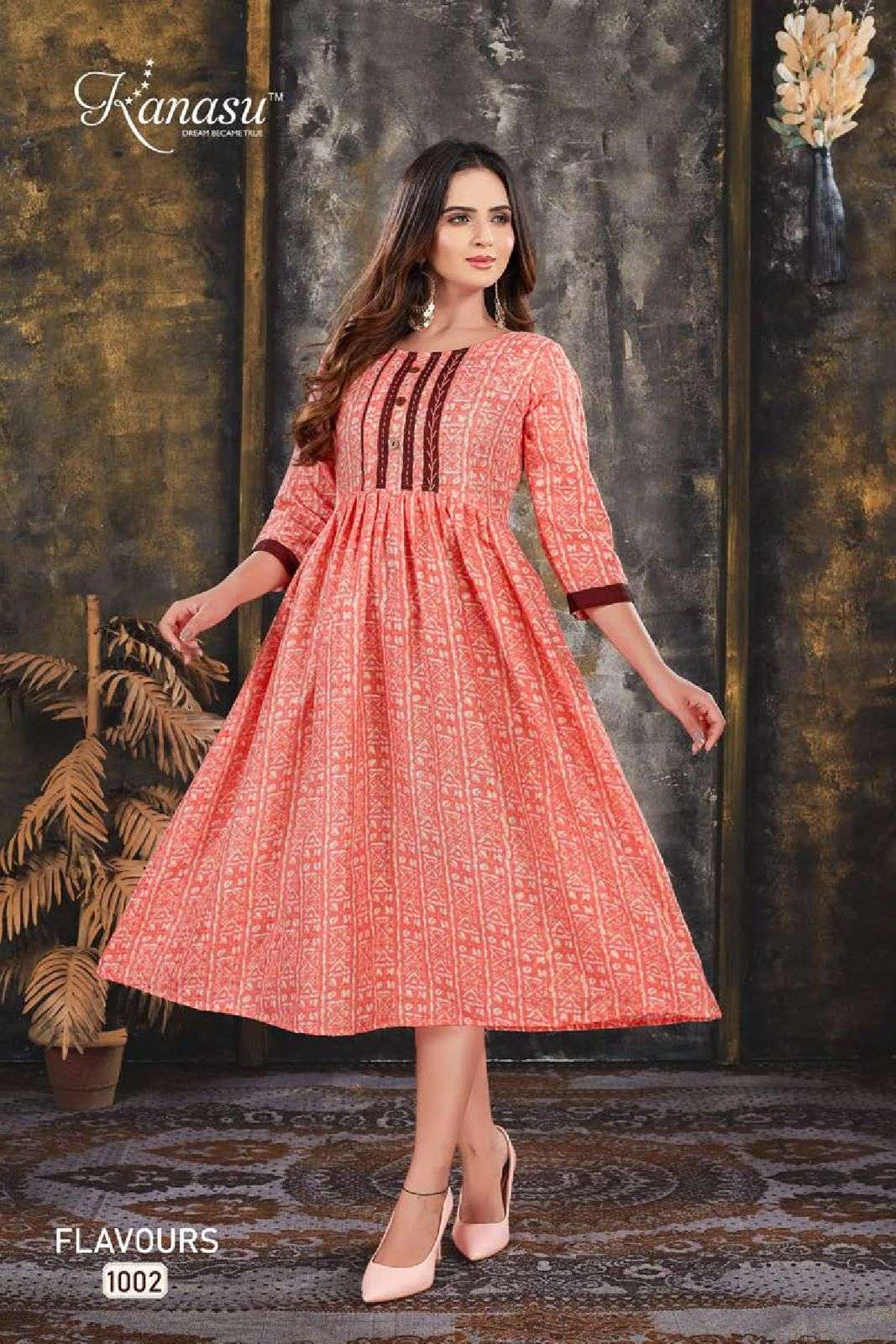 Dear Customers, Welcome to KANASU (KURTI) .., We are introducing KANASU new catalog 📕Catalogue:- FLAVOURS 👗Cloth :- HEAVY D-CAPSULE REYON PRINT ✅Concept *FLAIR WITH KATHA WORK PATTERN * Length :- 45 FLAIR :- 40 Rate : - 385/- Size:- M L XL XXL