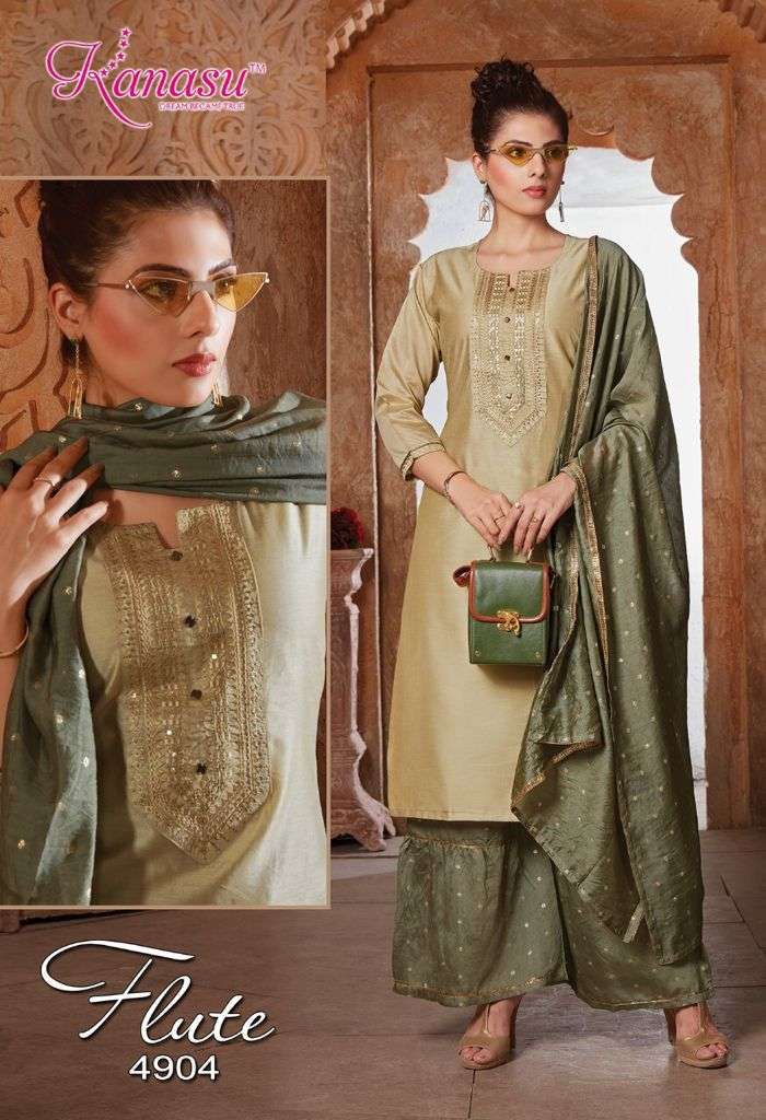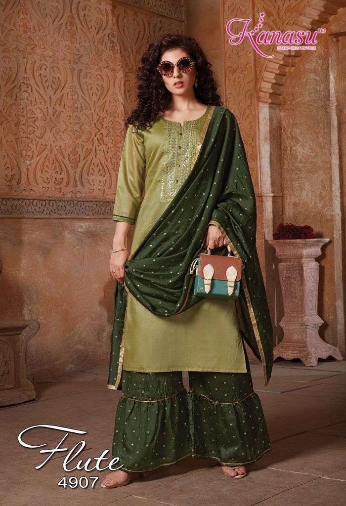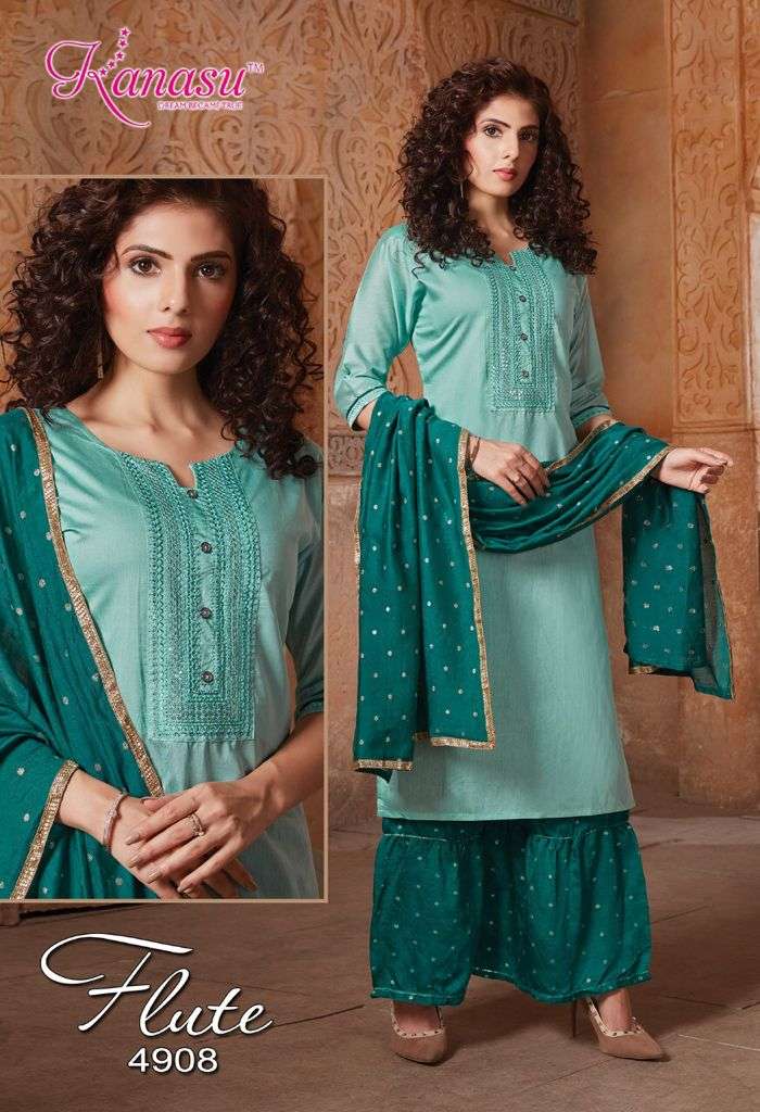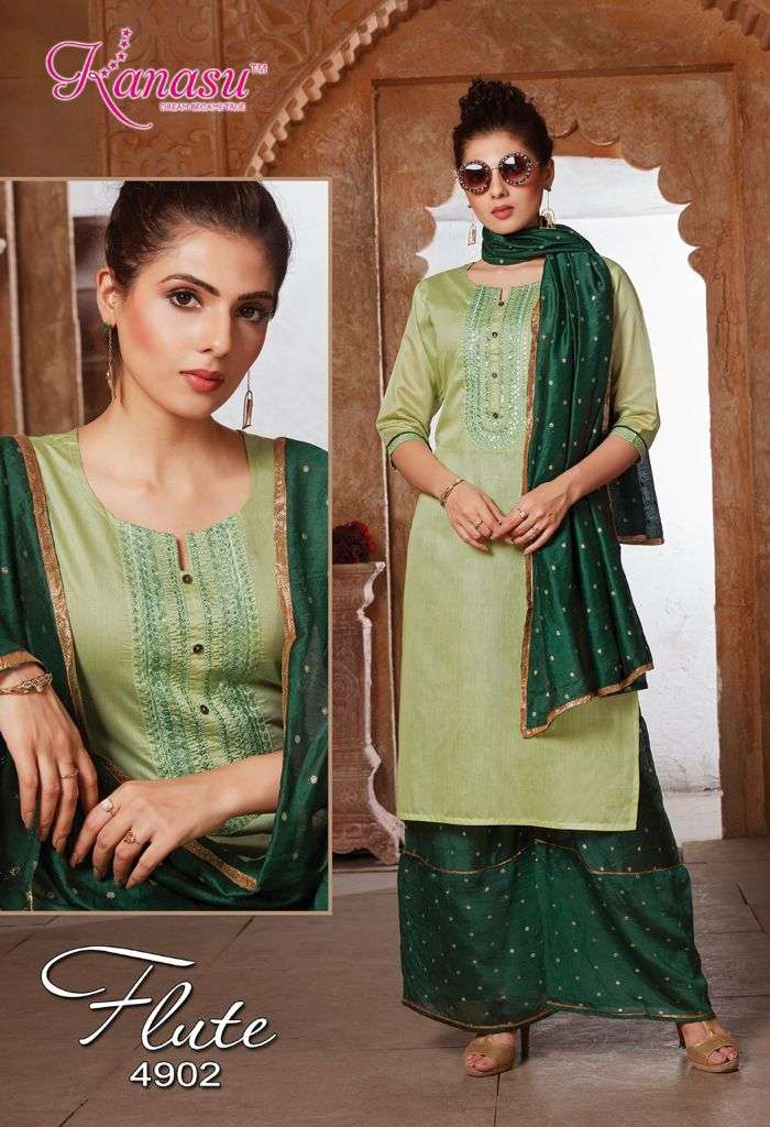 | Other Details | KANASU KURTI We are introducing KANASU 'S new catalog _ Catalogue:- FLUTE cloth :- DAIBLE SILK Bottom :- *DAIBLE SILK BUTTI SHARARA PATTERN * DUPATTA:- DAIBLE BUTTI SILK Concept :- *TOP COMPUTER  NECK SEQUENCE WITH SLEEVES WORK LENGTH TOP:-42 LENGTH SHARARA:-40 Size:-  M L XL 2XL AVAILABLE 08 DESIGNS CATALOGUE |
