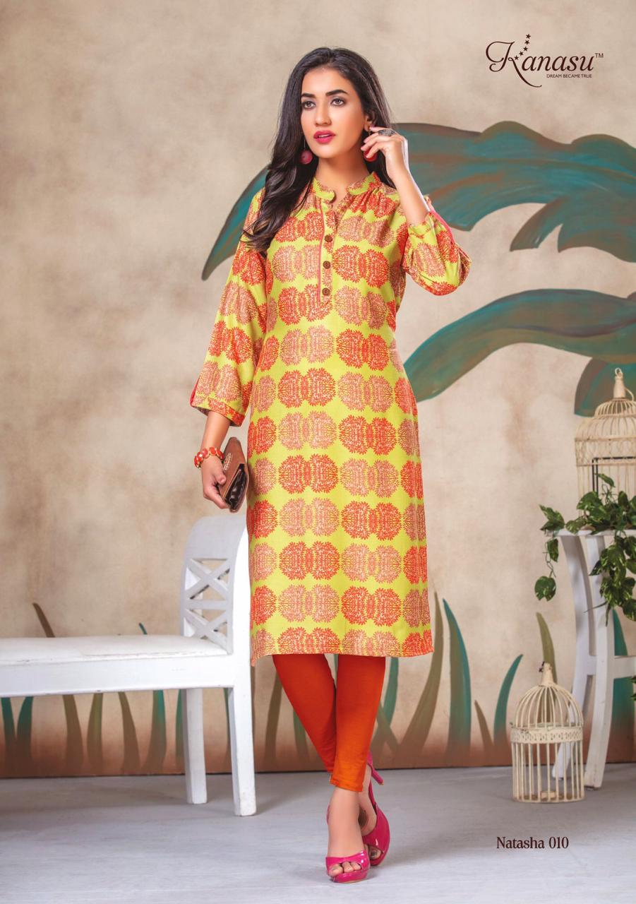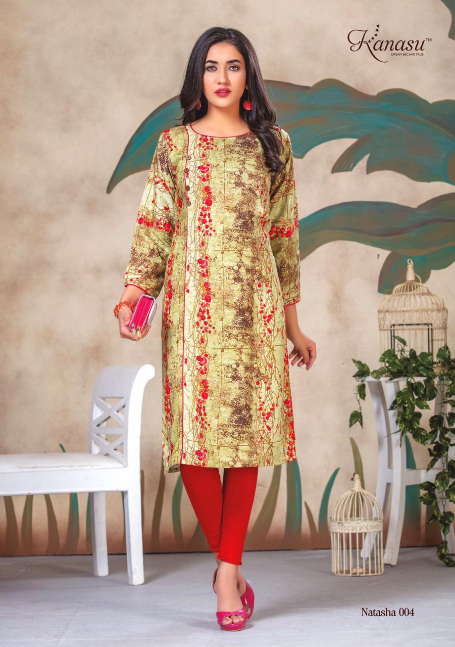 Greeting from KANASU KURTI We are introducing KANASU S new catalog _ Catalogue:- NATASHA cloth :- REYON PRINT(14KG) â Concept :- * STRAIGHT WITH PRINT CONCEPT* Length :- 42â Size:- M L XL 2XL 3XL AVAILABLE Rate : - 380 10 DESIGNS CATALOGUE |