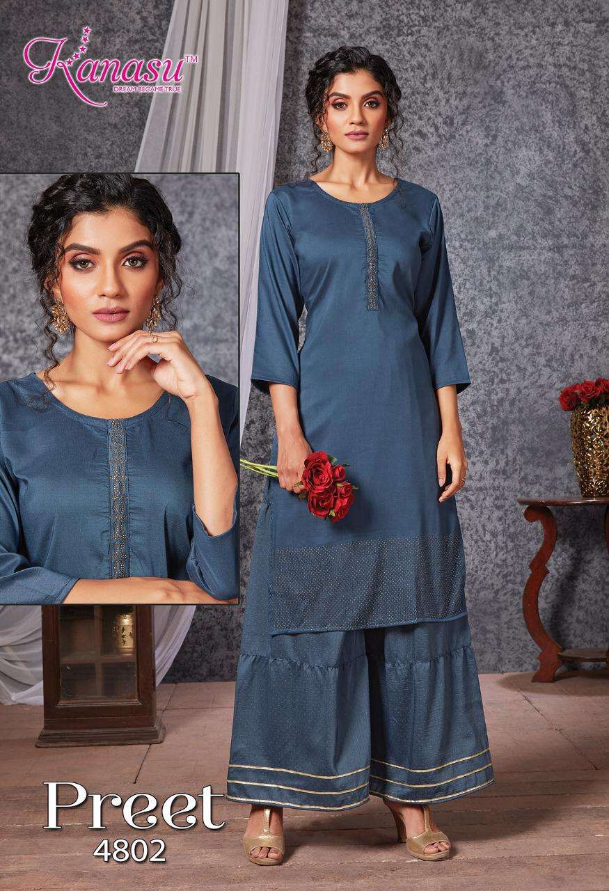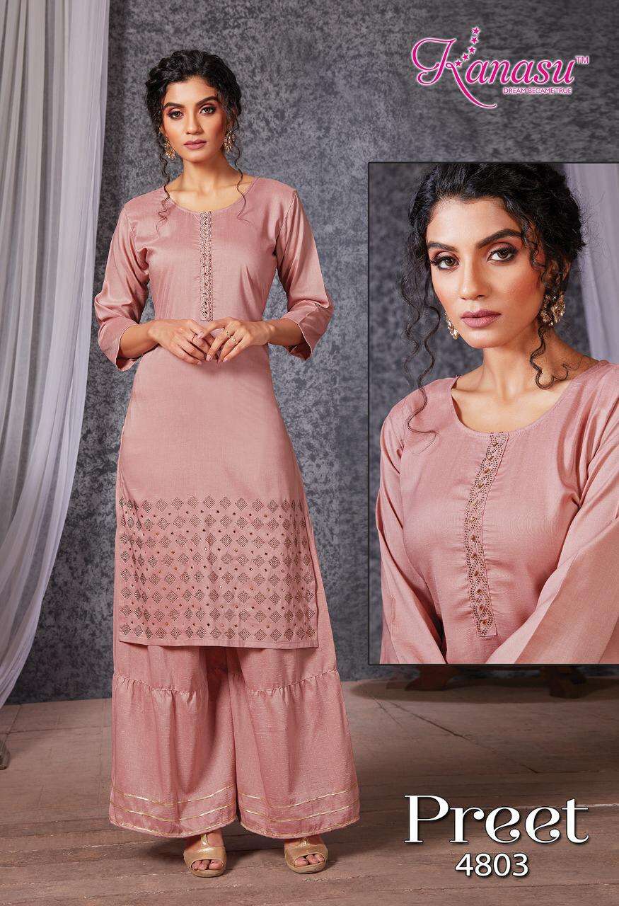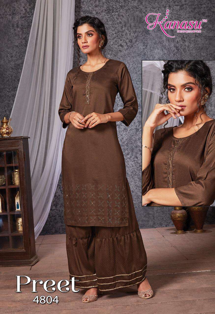 | Other Details | KANASU KURTI We are introducing KANASU 'S new catalog _ Catalogue:- PREET cloth :- CHINON SILK Bottom :- SHARARA (CHINON SILK BUTTI) Concept :- TOP SIROSKI WORK & SHARARA TOP LENGTH:-      41+ BOTTOM LENGTH:- 40 Size:-  M L XL 2XL AVAILABLE 08 DESIGNS CATALOGUE  |