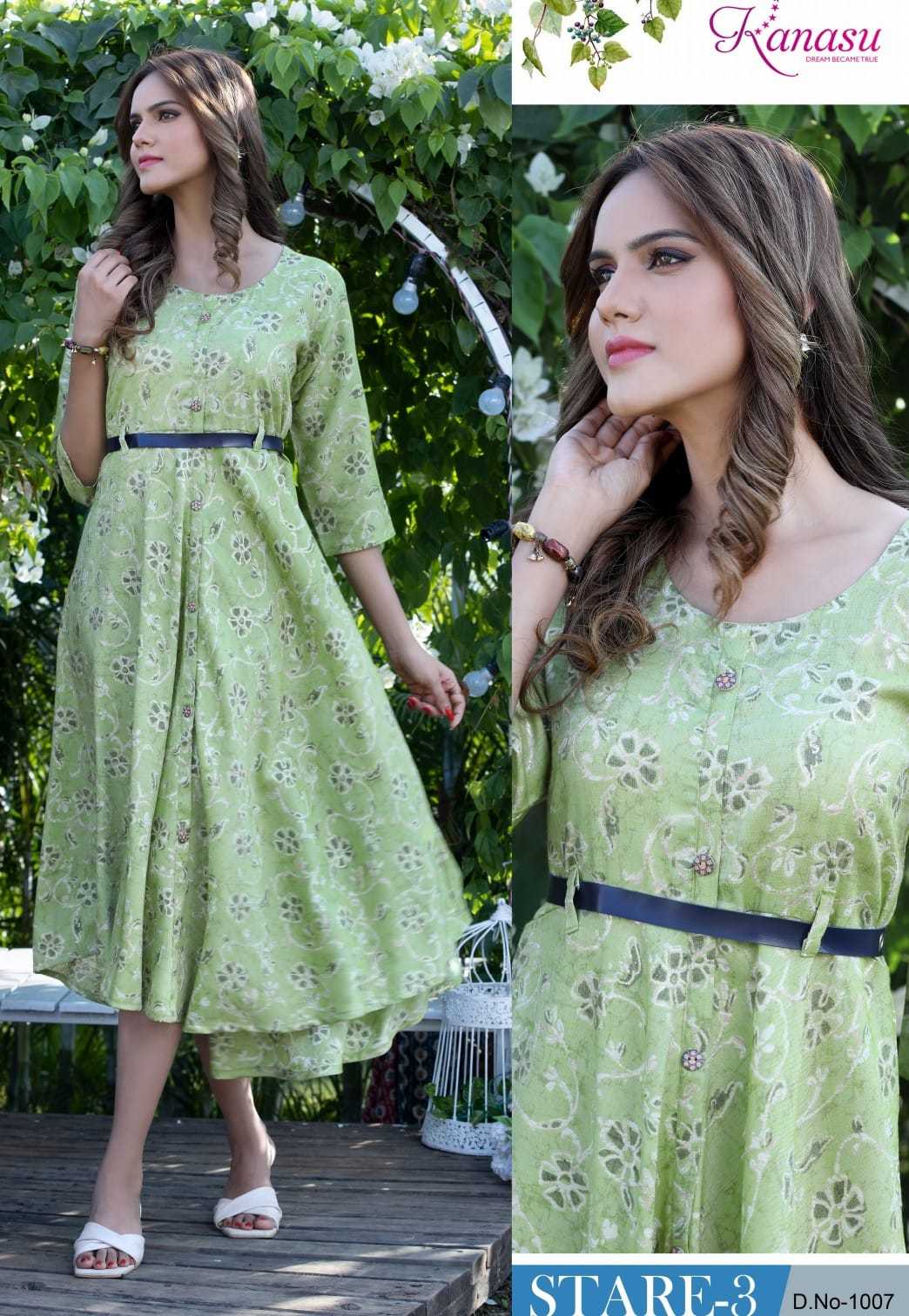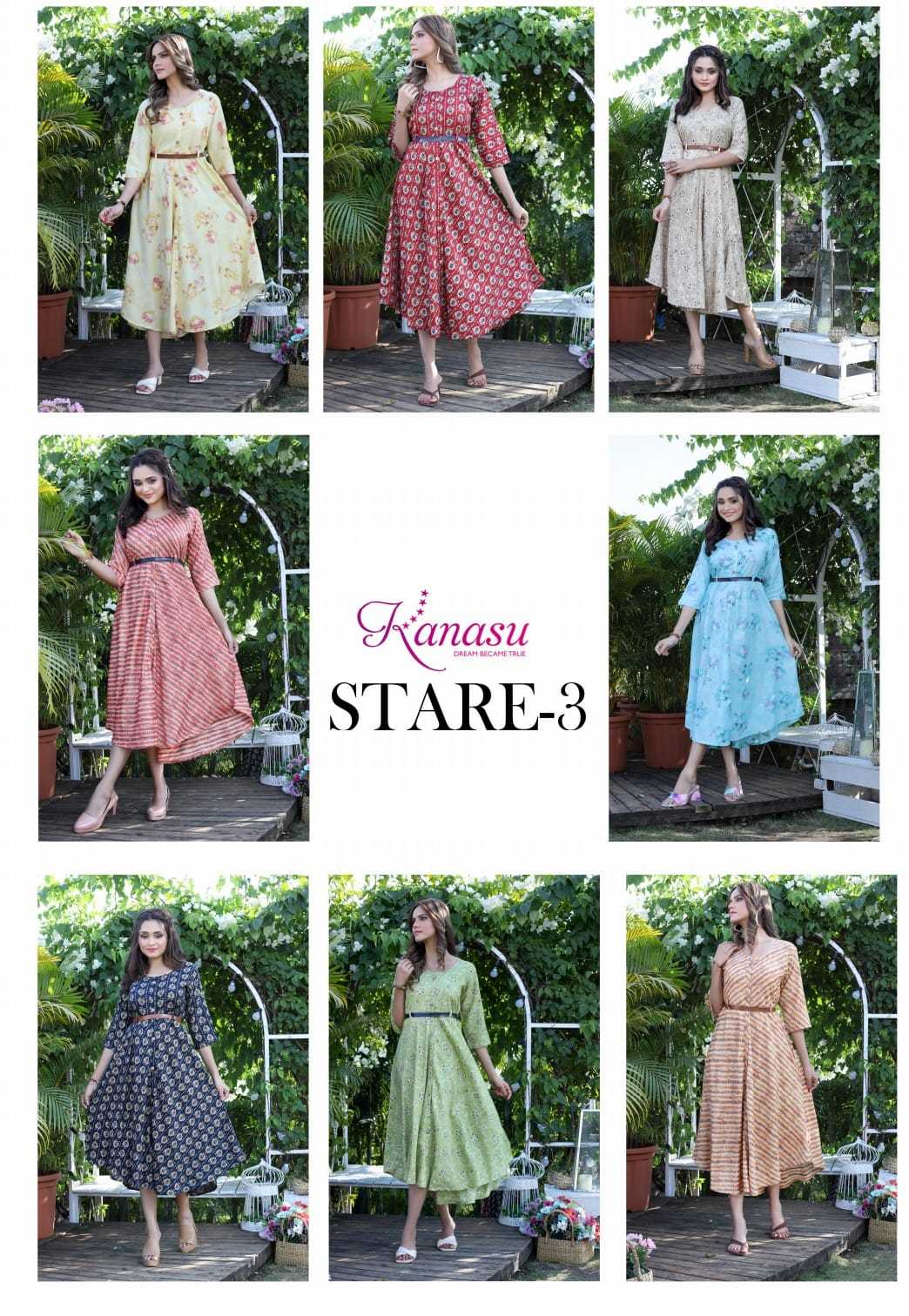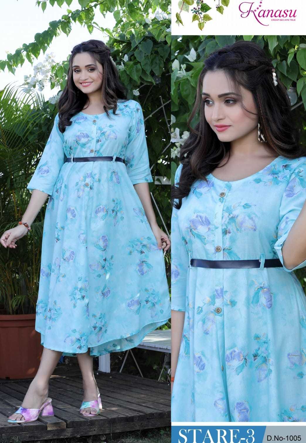 Dear Customers, Welcome to KANASU (KURTI) .., We are introducing KANASU new catalog 📕Catalogue:- STARE VOL-3 👗cloth :- * HEAVY REYON CAPSULE PRINT (14kg QUALITY)* ✅Concept *AUREPH FLAIR WITH BELT PATTERN * Length :- 45 FLAIR :- 60 Rate : - 535 Size:- M L XL XXL 3XL