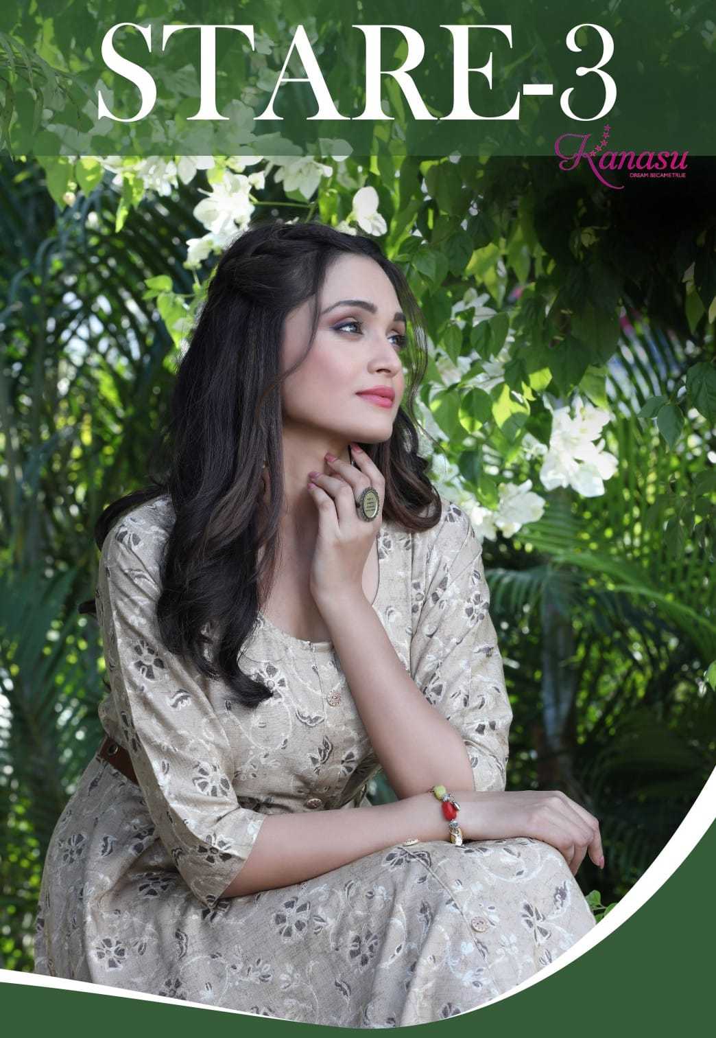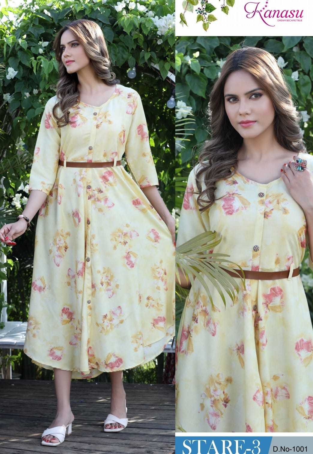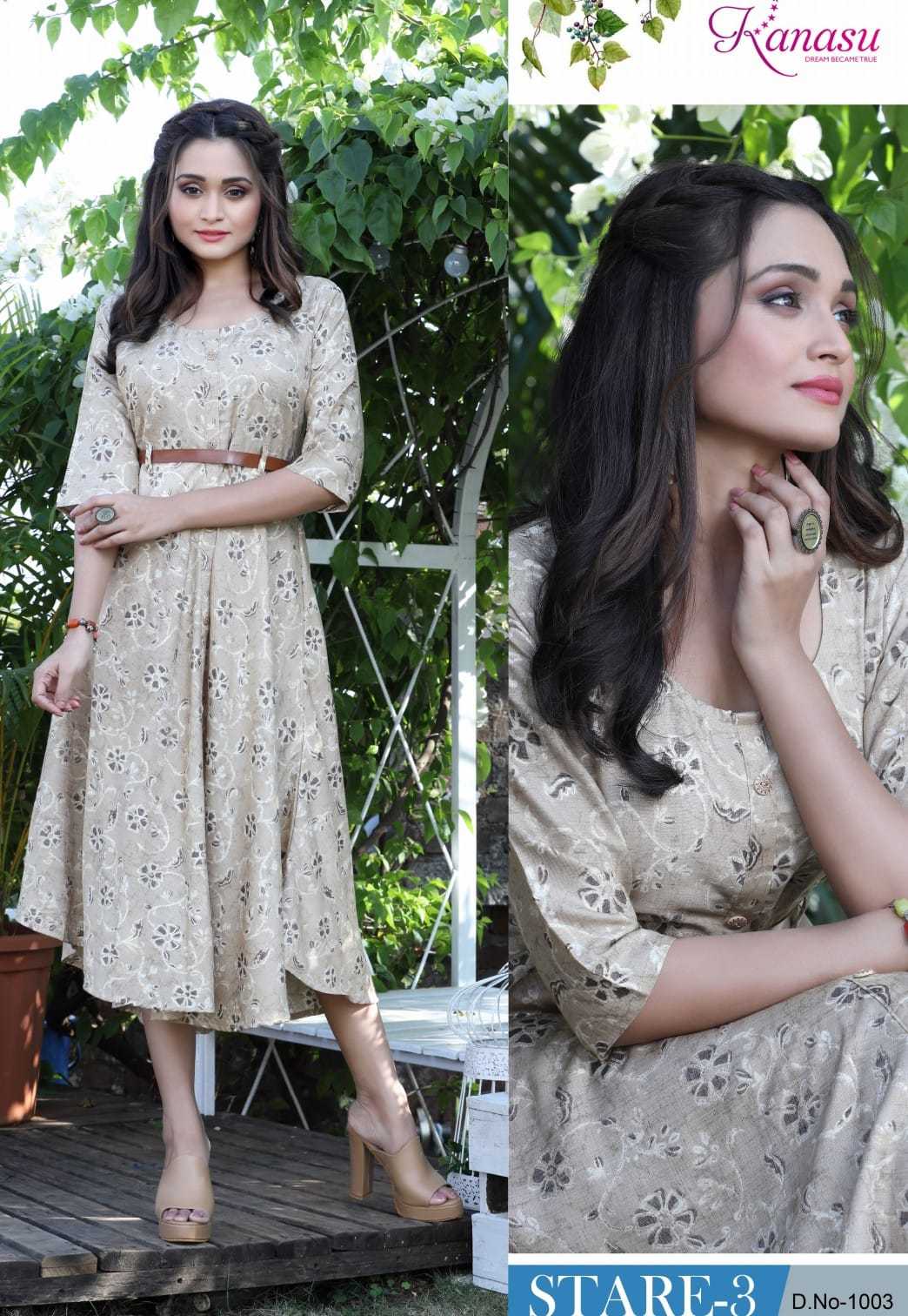 Dear Customers, Welcome to KANASU (KURTI) .., We are introducing KANASU new catalog 📕Catalogue:- STARE VOL-3 👗cloth :- * HEAVY REYON CAPSULE PRINT (14kg QUALITY)* ✅Concept *AUREPH FLAIR WITH BELT PATTERN * Length :- 45 FLAIR :- 60 Rate : - 535 Size:- M L XL XXL 3XL