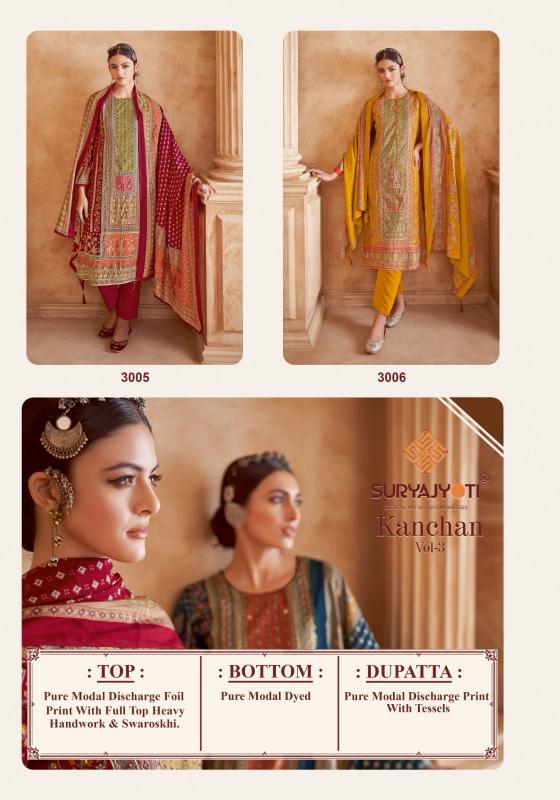 👫DEAR CUSTOMER👫 🙏WELCOME TO SURYAJYOTI 😍LAUNCHING OF SURYAJYOTI’S NEW FANCY CATALOG 📘CATALOGUE: KANCHAN VOL-3 👗TOP:- PURE MODAL DISCHARGE PRINT WITH FOIL,HEAVY HAND WORK FULL TOP AND SWAROVSKI 👖BOTTOM:- PURE MODAL DYED 🧣DUPATTA:- PURE MODAL DISCHARGE PRINT WITH TESSELS CUT:- 👚2.50-👖2.50-🧣2.25 💸RATE:- 865/- 🧳PACKING:- EXCLUSIVE POUCH PACK WITH BAG |