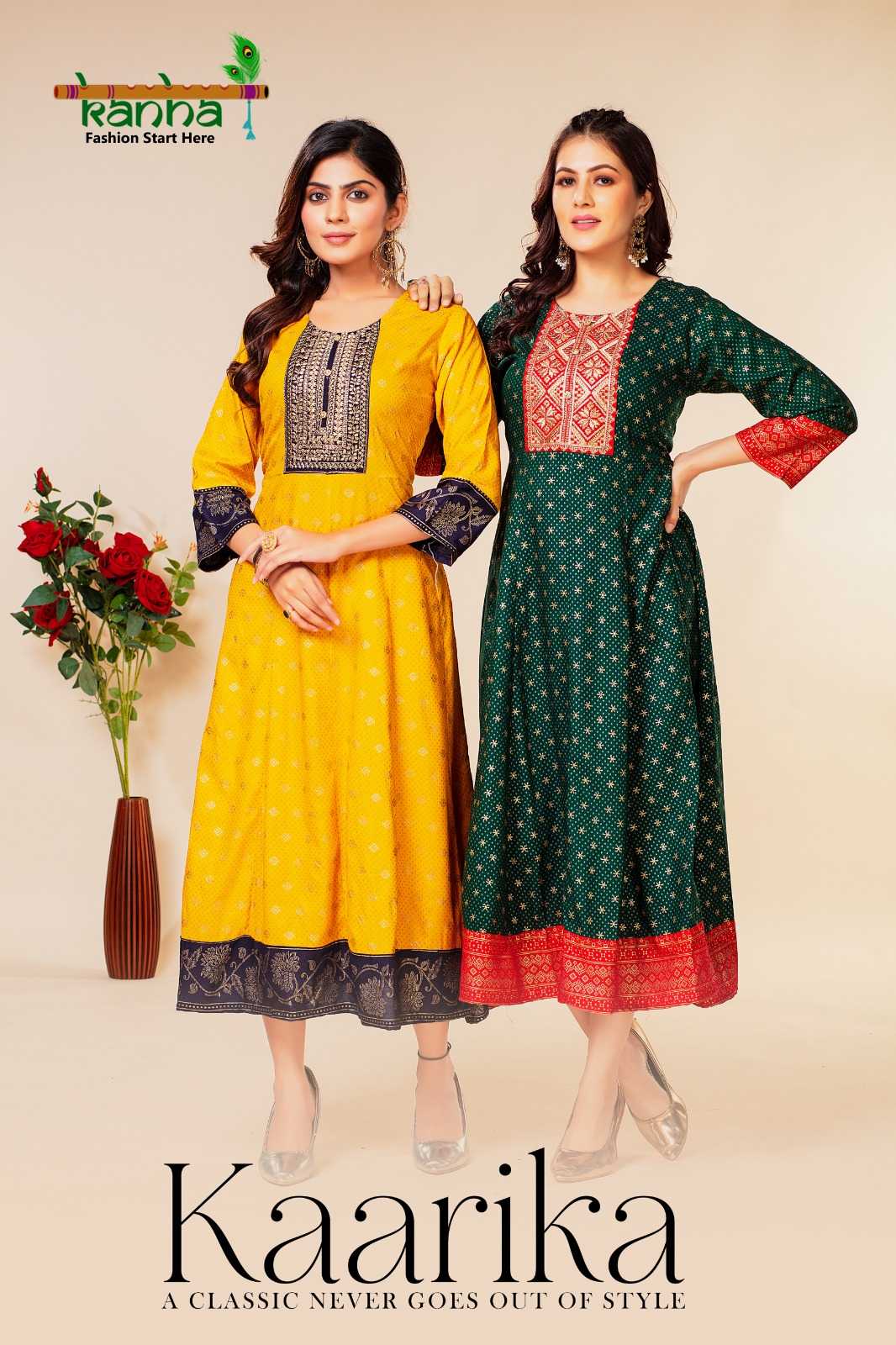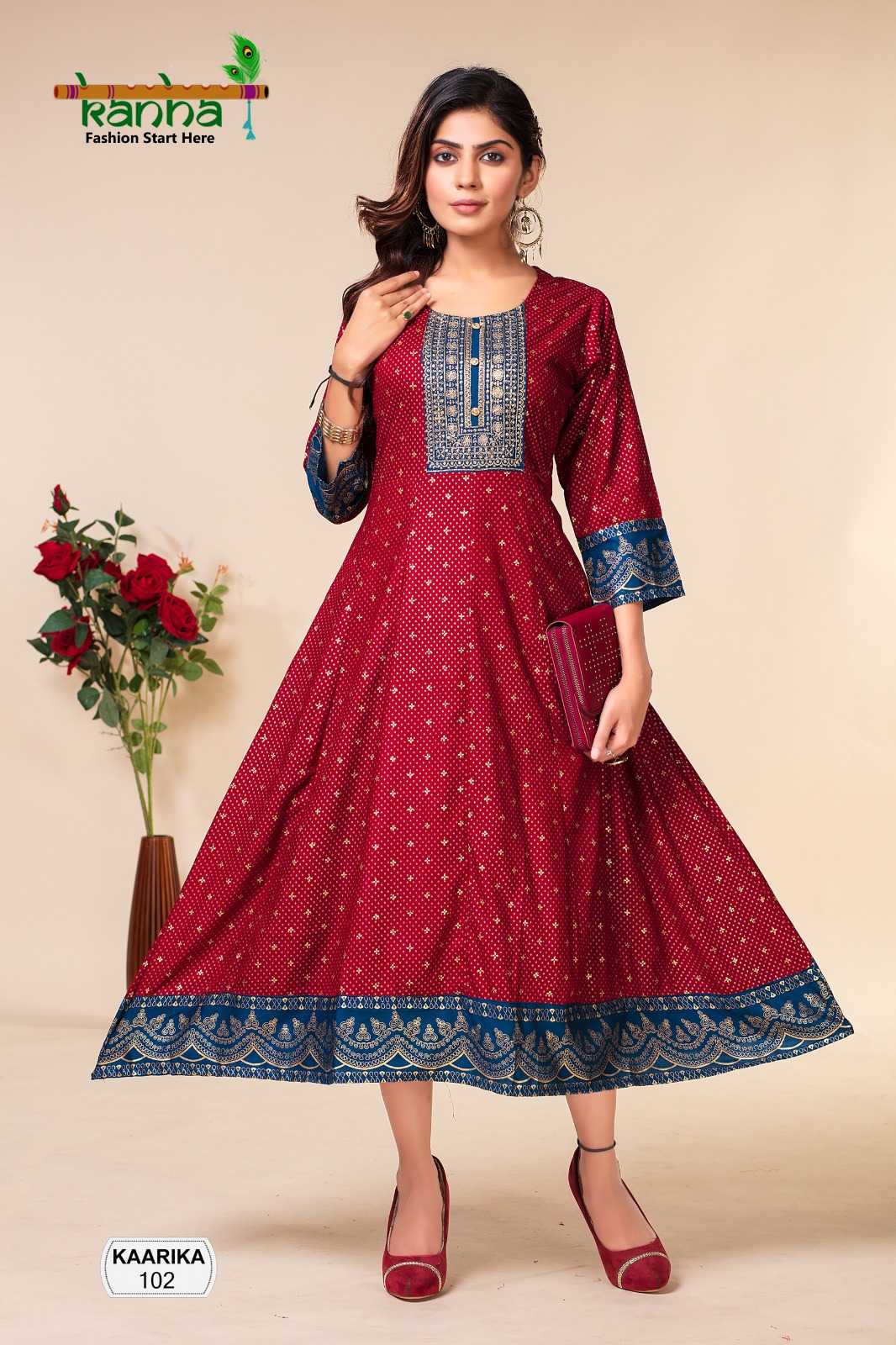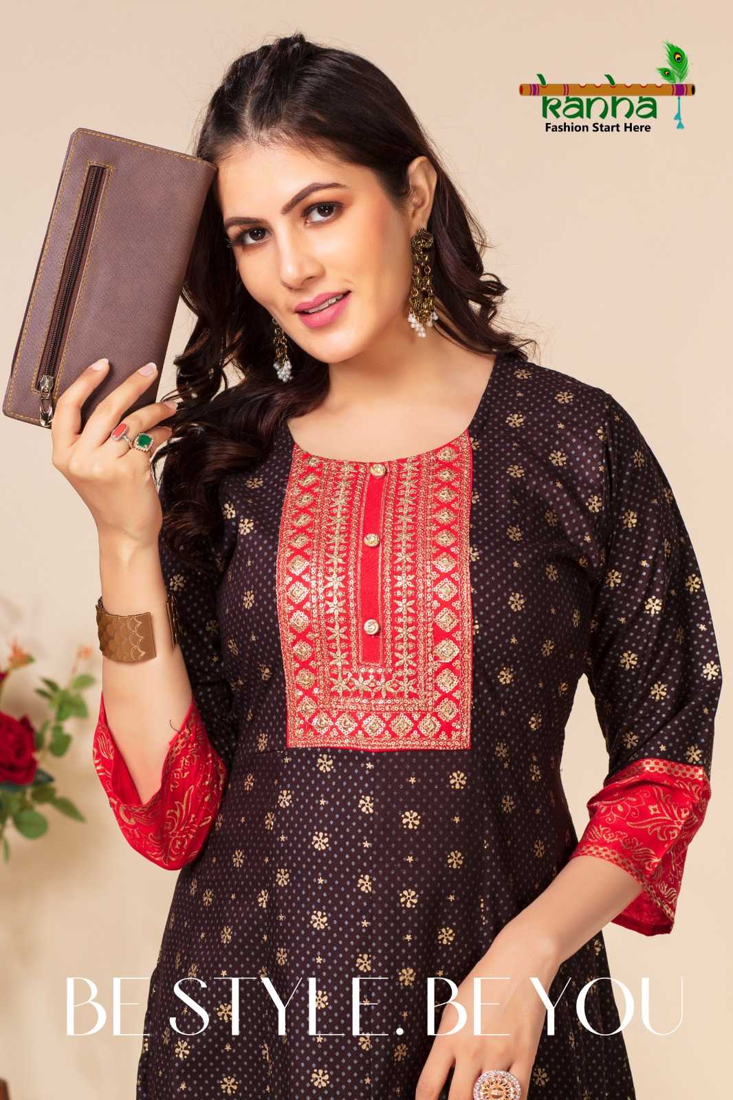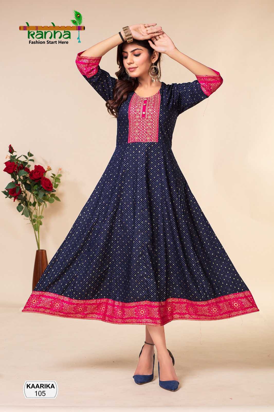 kanha fashion present kaarika fullstitch rayon flair kurti with neck work