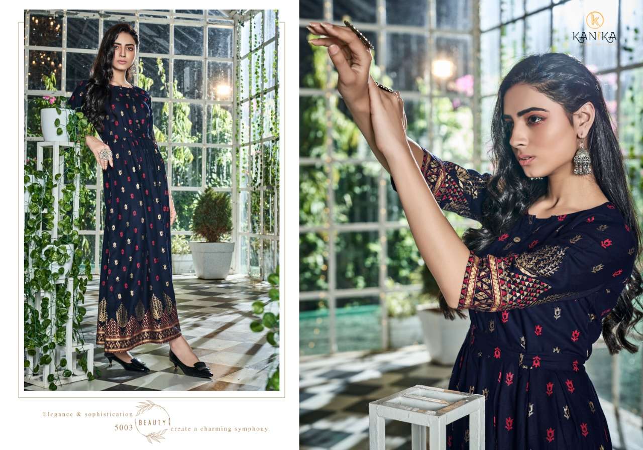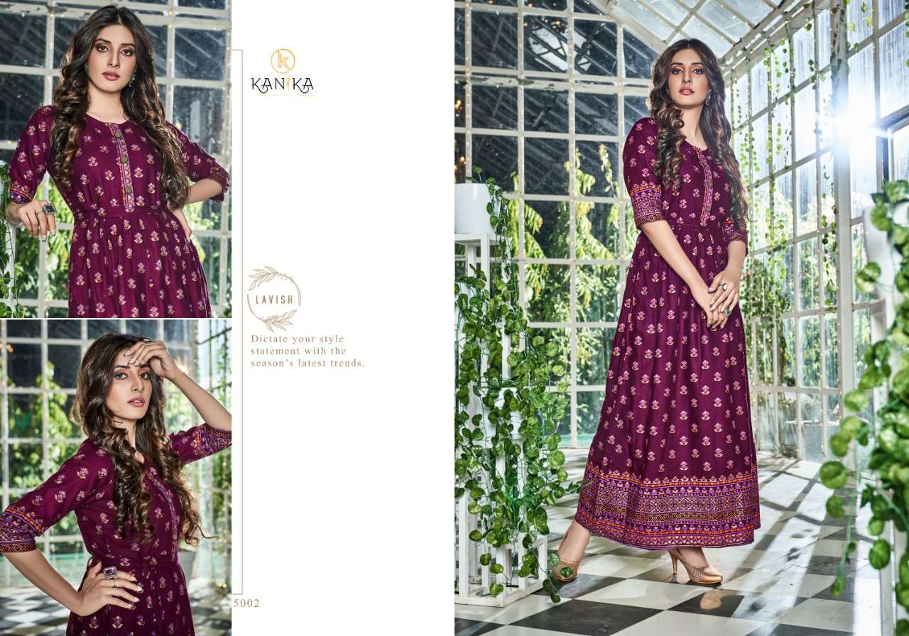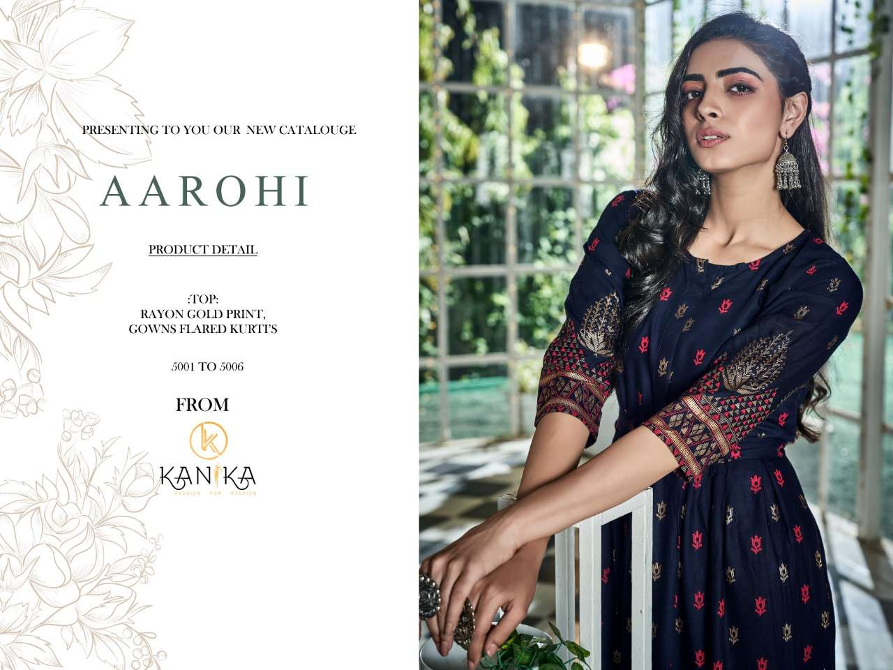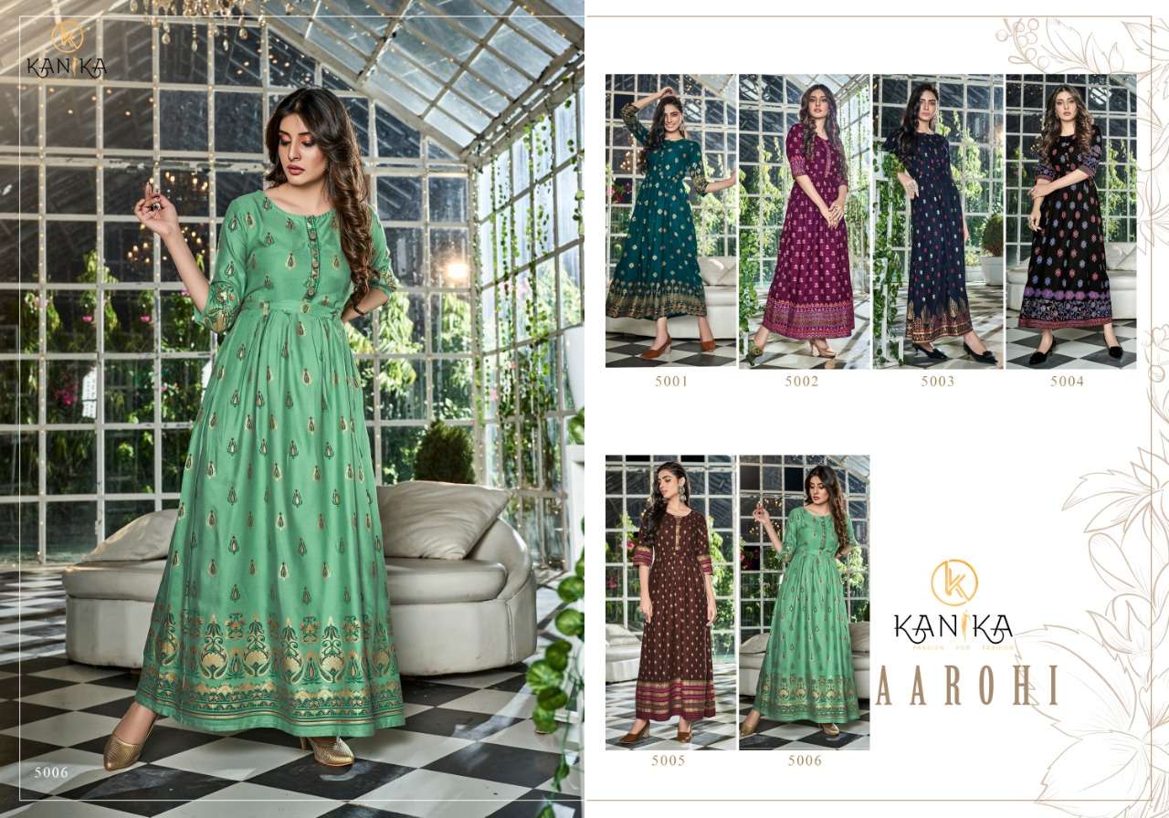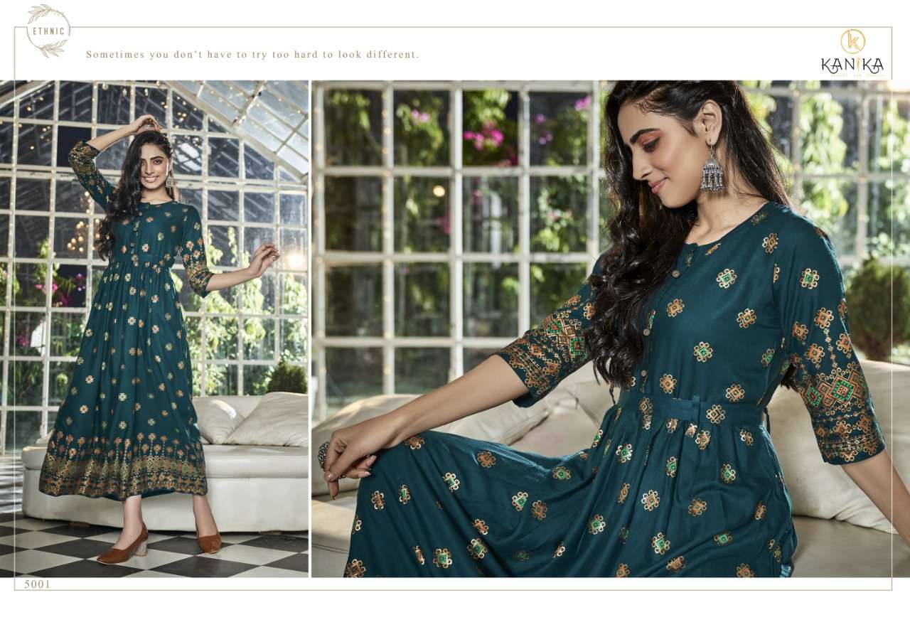 kanika present aarohi rayon gold foil printed flared kurti supplier
