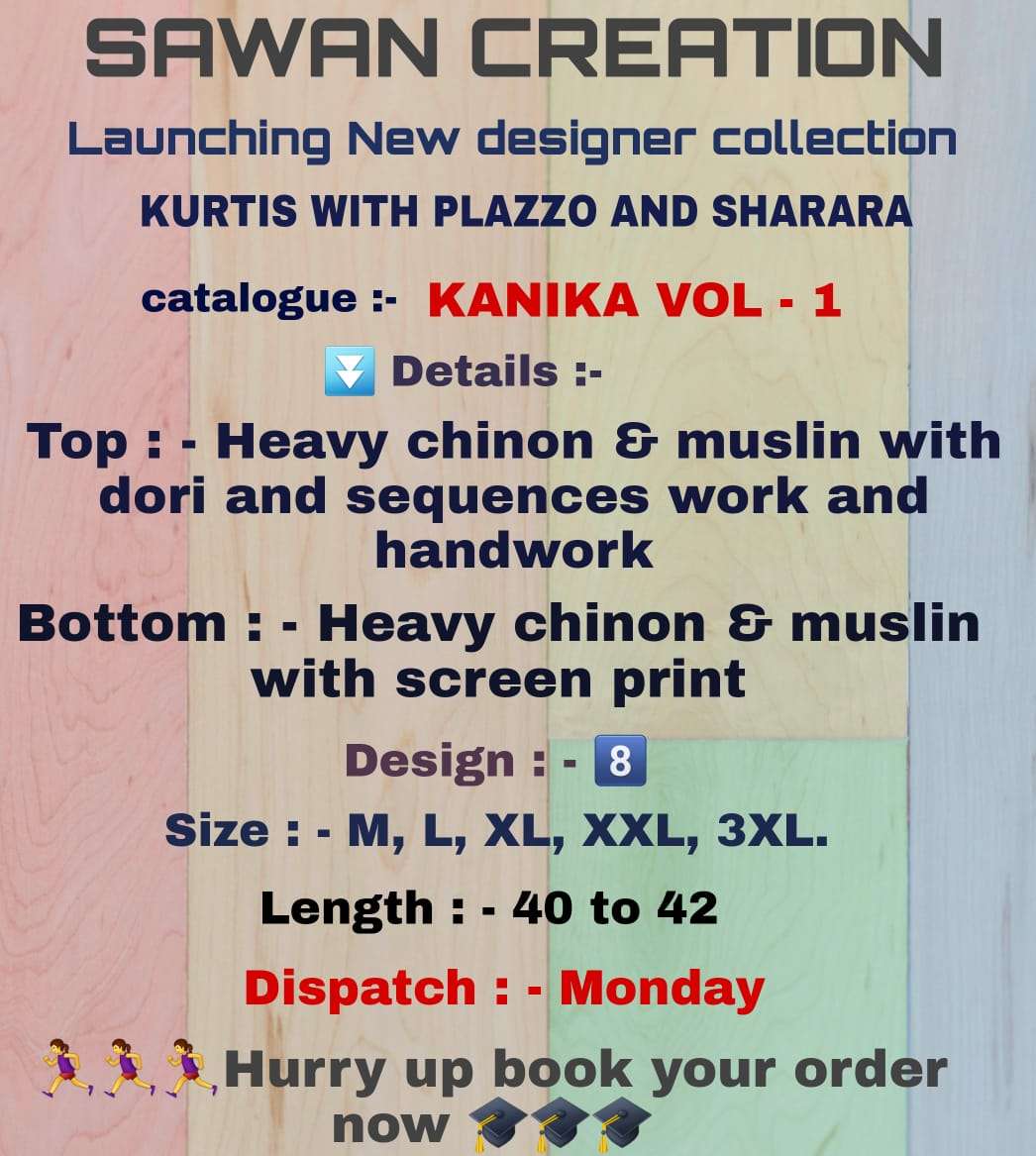Brand - Sawan Catlog name - KANIKA VOL-1. Rate- 725/- per pcs . Set to set. Delivery from tomorrow |