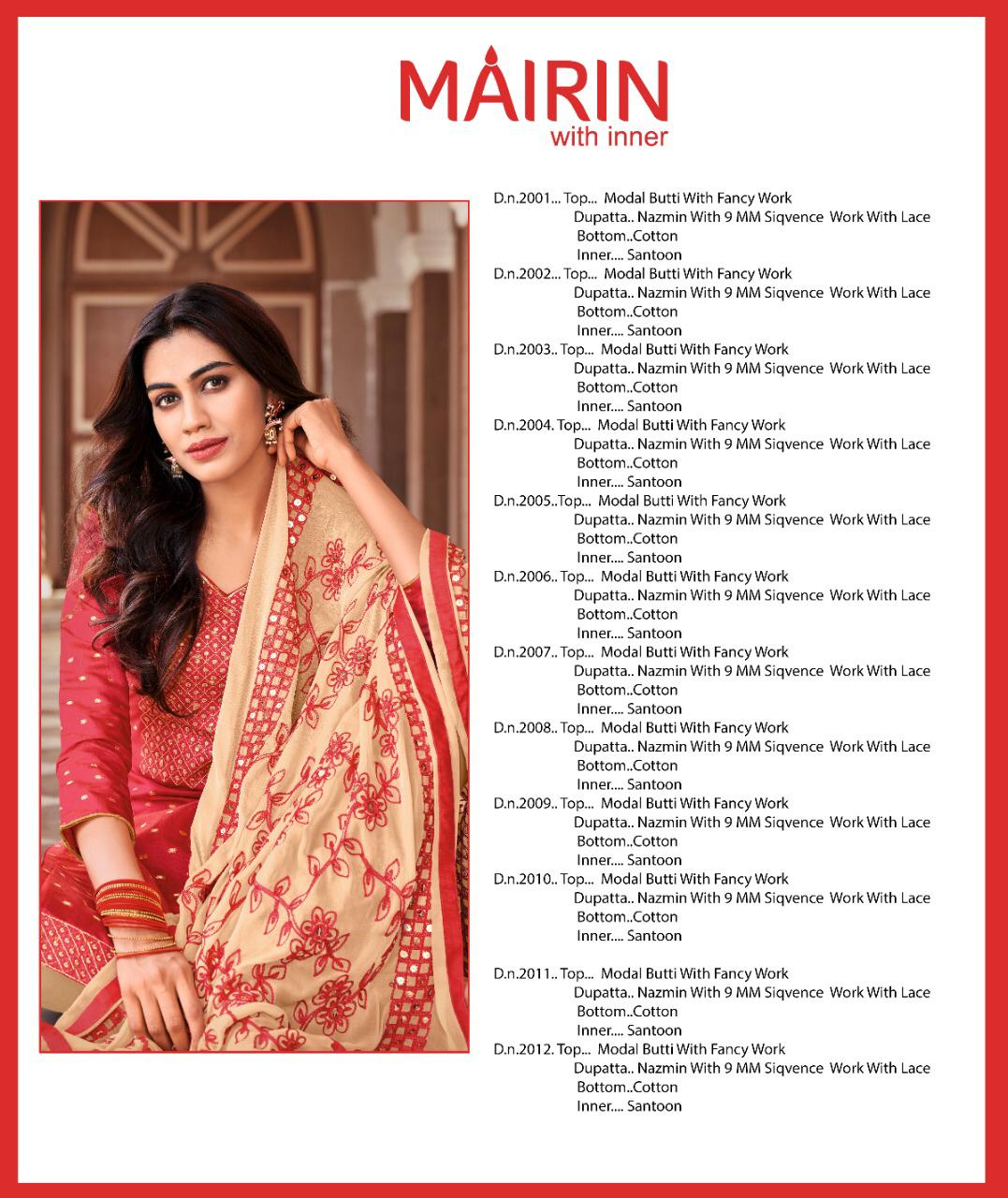 MAIRIN TOP MODAL BUTI WITH FANCY WORK BOTTOM COTTON INNER SANTOON DUPATTA NAZMIN WITH 9M M SIQVENCE WORK WITH LACE RATE - 599/-₹ PC - 12 |