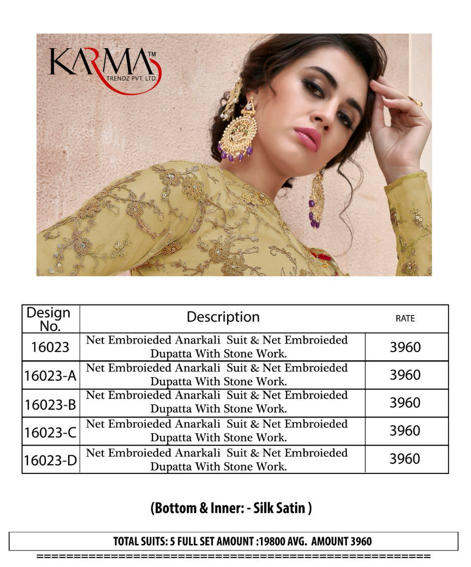"KARMA"_ BRAND CREATED BY YOU..... Dn.1â£6â£0â£2â£3⣠Colour plus âÂÂNET HEAVY EMBROIDERED ANARKALI TOP AND NET EMBROIDERED DUPATTA WITH STONE WORK COLLECTION" It is a Brand Synonymous with Sophistication and Style it is for the Women of today,who prefers to make a Statement whenever she step out. So thats the time we launched our most demanded concept Designer Heavy Net Embroidered Anarkali style collection of 5⣠designs....... â Quality Fabrics... No.1 â Best Designs.... â Latest Colours.... â Rich Combinations.... Fabric Details:- Top : - Net heavy embroidered top and additional diamond work. Inner :- Silk satin Bottam -Silk satin Dup. : -Net embroidered with diamond work DISPATCH:-27 NOVEMBER |