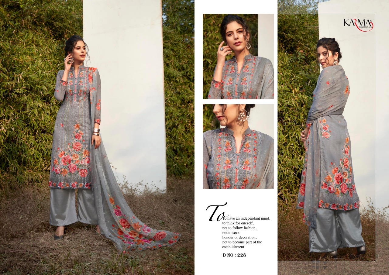 "Karma"_ BRAND CREATED BY YOU..... INAAYAT VOL-2 223 SERIES âÂÂGEORGETTE EMBROIDERY WORK DIGITAL PRINT COLLECTION WITH PURE CHIFFON EMBROIDERY WORK DIGITAL PRINT DUPATTA" It is a Brand Synonymous with Sophistication and Style it is for the Women of today,who prefers to make a Statement whenever she step out. So thats the time we launched our most pure chiffon digital print dupatta concept Designer collection of 6 designs....... Fabric Details:- Top : - Georgette Embroidery work with digital print . Bottam - Santton Dup. : Pure chiffon Embroidery work with digital print Set to set. GST 5 Percent Extra. Delivery from today |