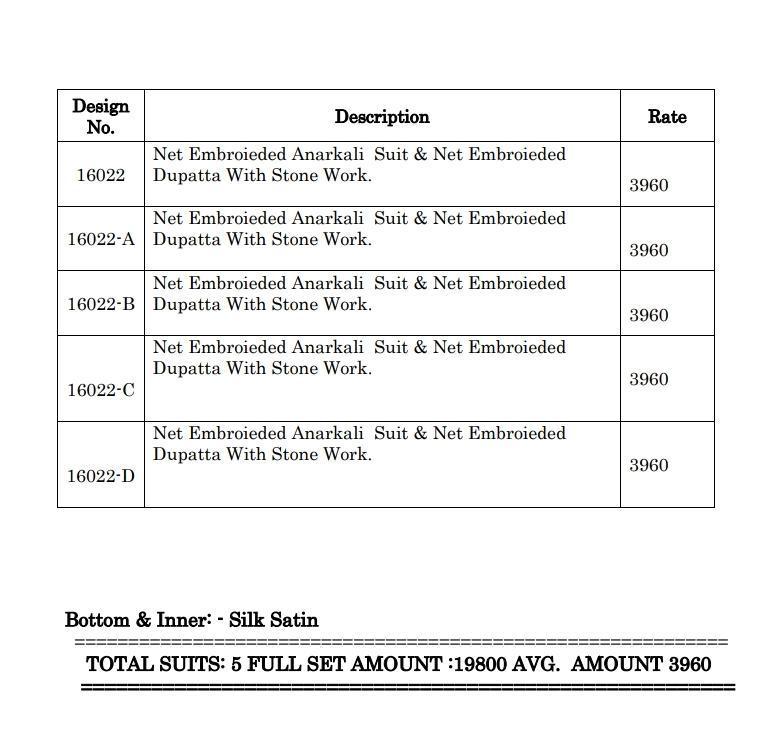 "KARMA"_ Dn.16022 Colour plus âÂÂNET HEAVY EMBROIDERED ANARKALI TOP AND NET EMBROIDERED DUPATTA WITH STONE WORK COLLECTION" It is a Brand Synonymous with Sophistication and Style it is for the Women of today,who prefers to make a Statement whenever she step out. So thats the time we launched our most demanded concept Designer Heavy Net Embroidered Anarkali style collection of 4 designs....... â Quality Fabrics... No.1 â Best Designs.... â Latest Colours.... â Rich Combinations.... Fabric Details:- Top : - Net heavy embroidered top and additional diamond work. Inner :- Silk satin Bottam -Silk satin Dup. : -Net embroidered with diamond work |