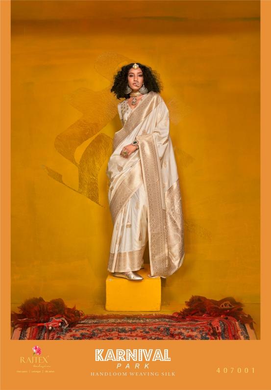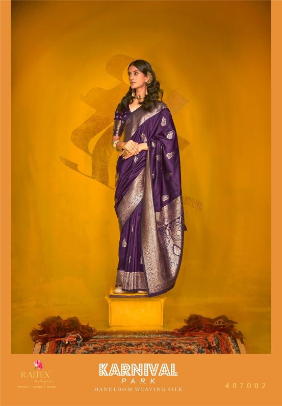 Brand -Rajtex Catalog Name - Karnival Park Series :- 407001 TO 407006 Rate : 1095/- +5% Gst Fabric: Two Tone Handloom Weaving Silk With Zari weaving Work Blouse: Two Tone Handloom Weaving Silk Occasion : Party Wear, Festival Wear |