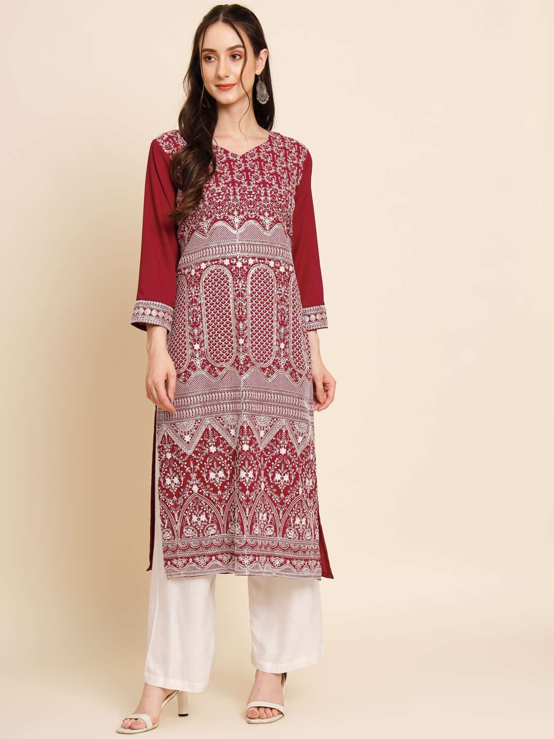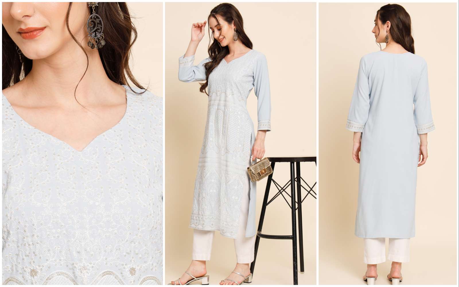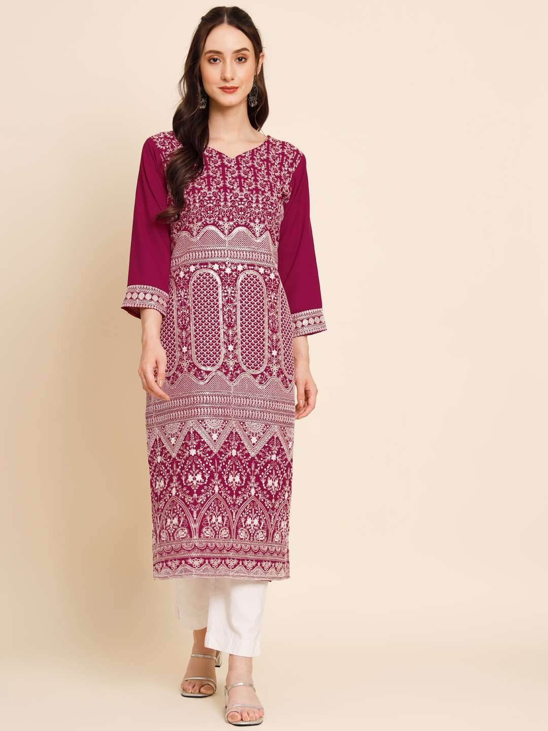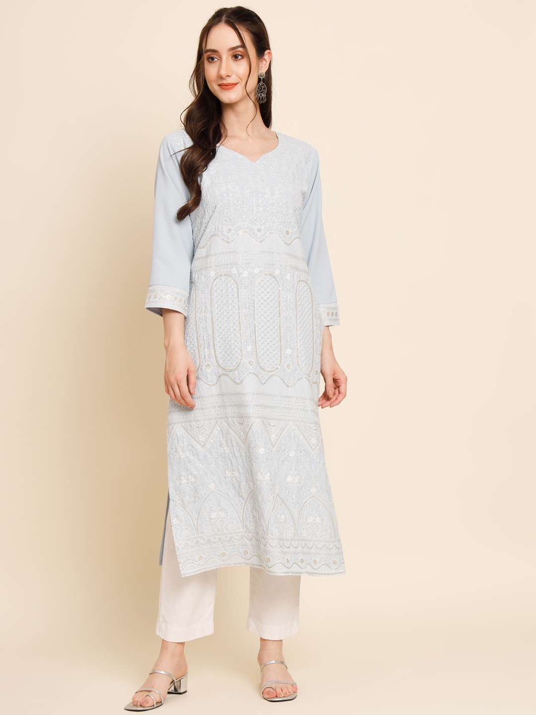 Kartavya Butter crepe Kurta with Embroidery Work Straight Shape Three Quarter Sleeves Sweetheart Neck |